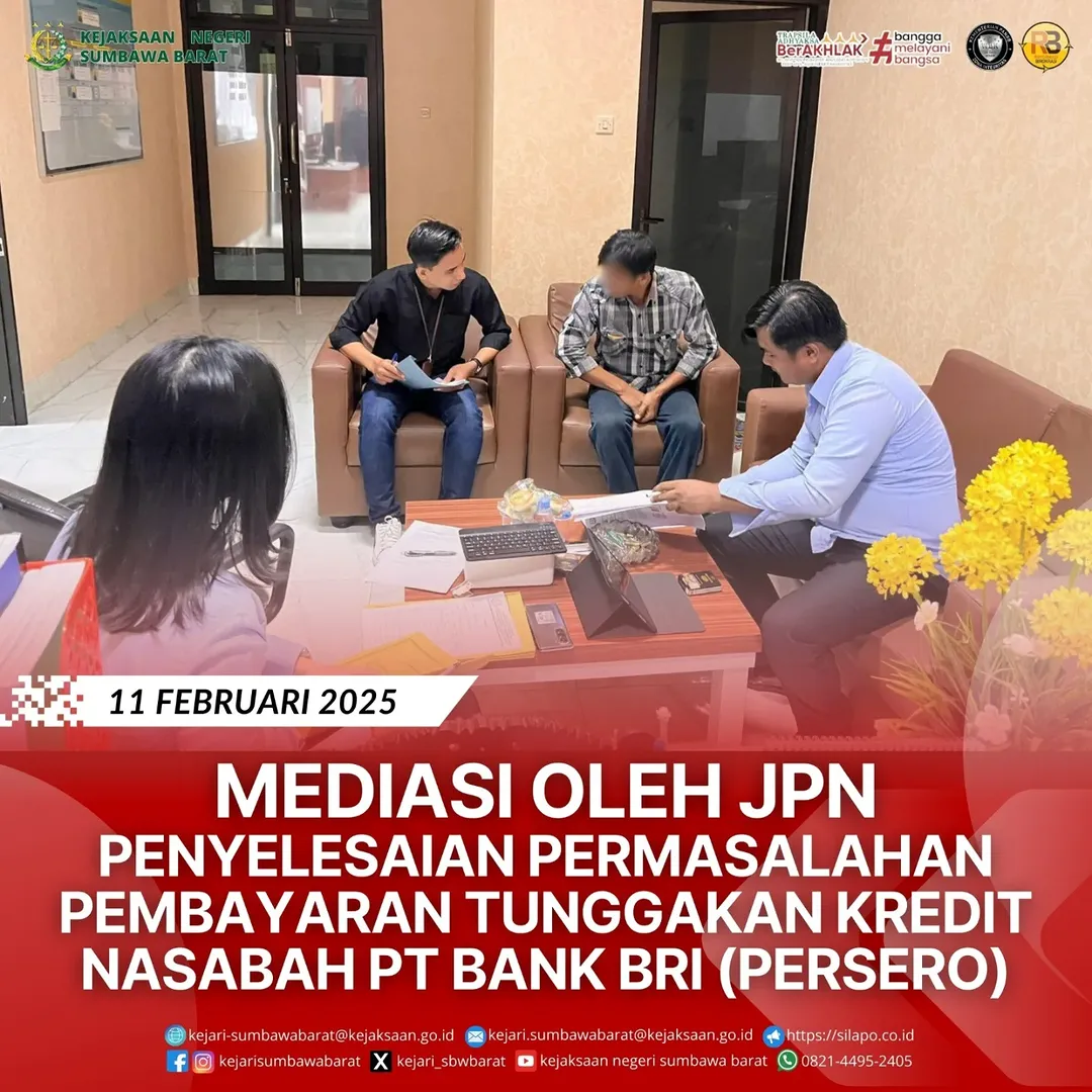 Pada hari Selasa, 11 Februari 2025 telah dilaksanakan Mediasi atas Permohonan Bantuan Hukum dari PT Bank Rakyat Indonesia (Persero) Tbk Cabang Sumbawa Besar tentang Permasalahan Pembayaran Tunggakan Kredit para Nasabah, yang dalam hal ini Mediasi antara Para Nasabah dan Perwakilan PT. Bank BRI dengan Kepala Seksi Perdata dan Tata Usaha Negara Reza Safetsila Yusa, S.H. selaku JPN bertindak sebagai mediator.