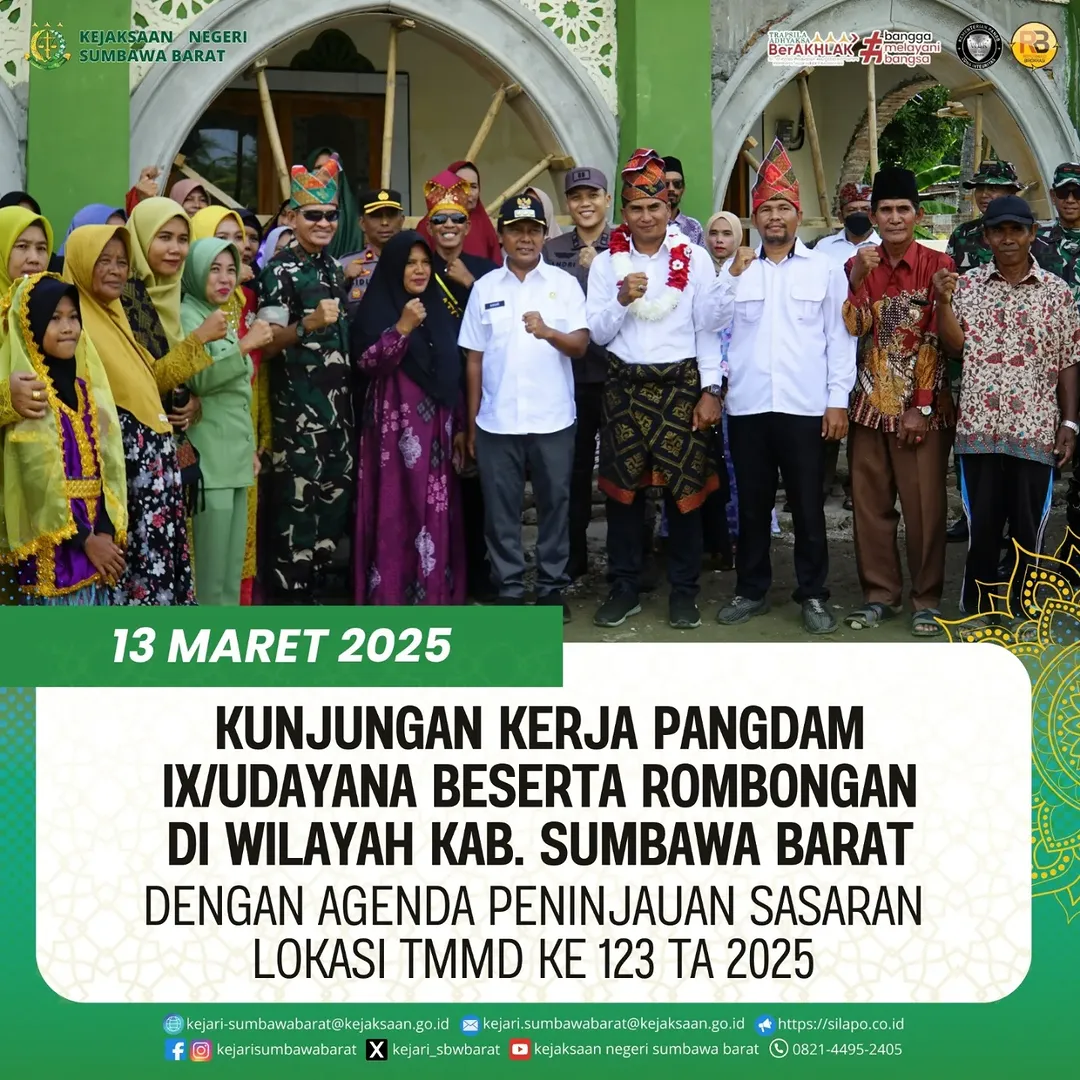 Pada Hari Kamis, 13 Maret 2025. Kepala Kejaksaan Negeri Sumbawa Barat diwakili Kasi PAPBB, Andri Setiawan, SH mengikuti kegiatan kunjungan kerja Pangdam IX/Udayana beserta rombongan di wilayah Kab. Sumbawa Barat dengan agenda Peninjauan sasaran lokasi TMMD ke 123 TA 2025 di Desa Batu Putih dilanjutkan dengan Buka Puasa Bersama di Hotel Whales dan Waves Kertasari Lodge Sumbawa Barat.