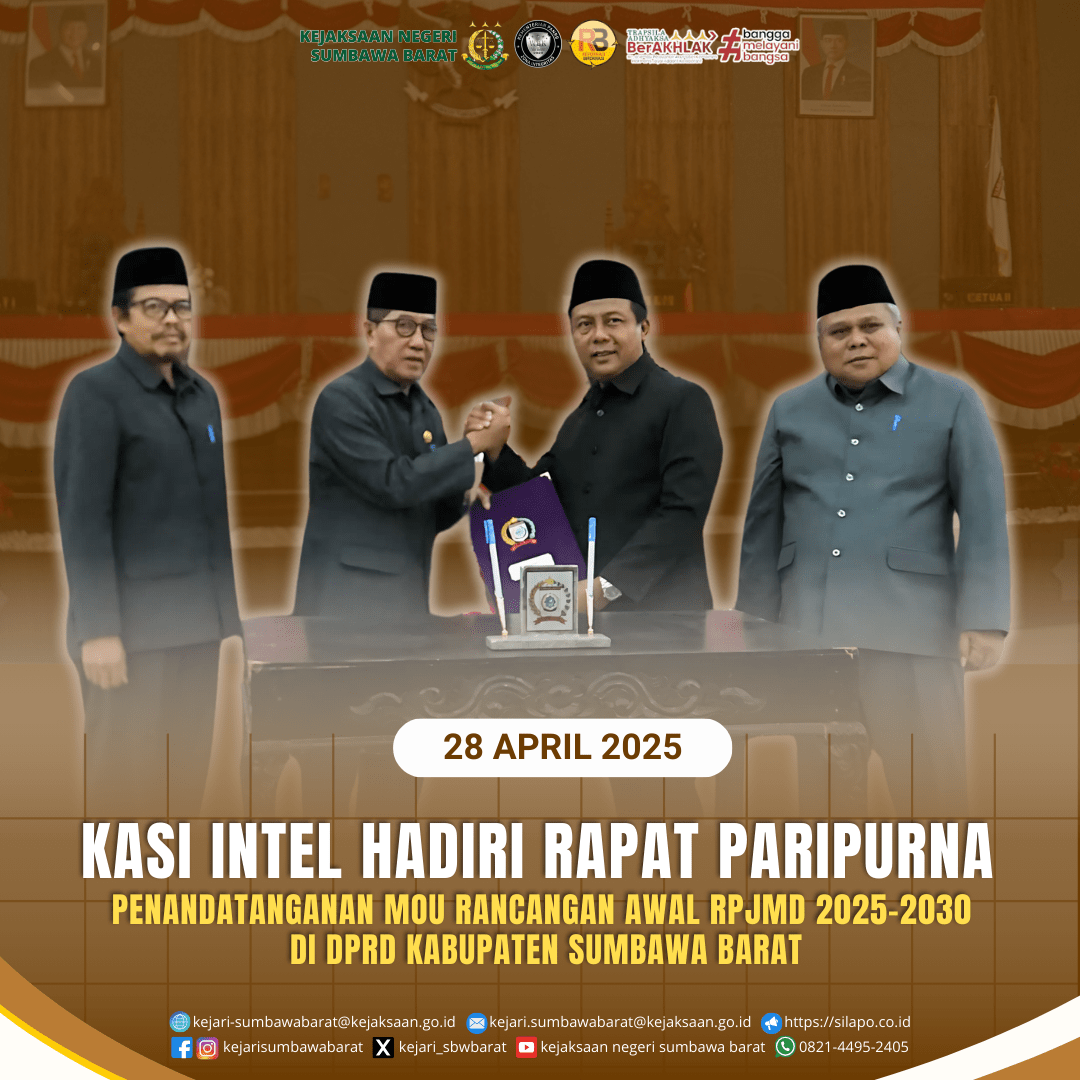 Pada hari Senin, 28 April 2025. Kepala Seksi Intelijen, Benny Utama, S.H mewakili Kepala Kejaksaan Negeri Sumbawa Barat menghadiri kegiatan Rapat Paripurna dalam Agenda Pendatanganan MoU Rancanagan Aawal RPJMD 2025-2030 yang bertempat di Ruang Sidang Utama DPRD Kab. Sumbawa Barat.