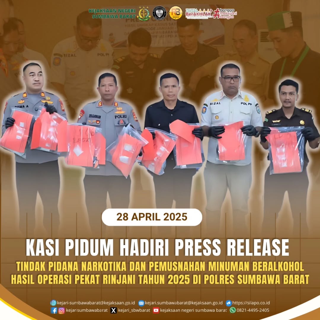 Pada hari Senin, 28 April 2025. kepala Seksi Tindak Pidana Umum, Rizki Taufani, SH mewakili Kepala Kejaksaan Negeri Sumbawa Barat dalam kegiatan press release terkait tindak pidana narkotika dan pemusnahan minuman beralkohol hasil operasi paket rinjani tahun 2025 bertempat di Aula Endra Dharmalaksana Polres Sumbawa Barat.