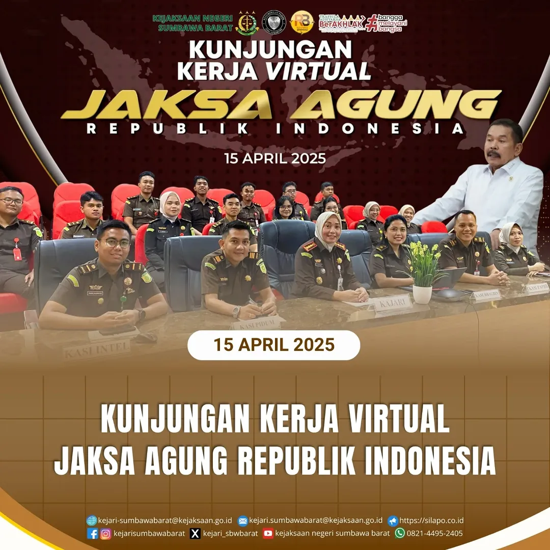Pada hari Selasa, 15 April 2025. Kepala Kejaksaan Negeri Sumbawa Barat, Dr. Titin Herawati Utara, SH.,MH bersama jajaran mengikuti kunjungan kerja Jaksa Agung Republik Indonesia secara virtual bertempat di Ruang Vidcon Kejari Sumbawa Barat.
