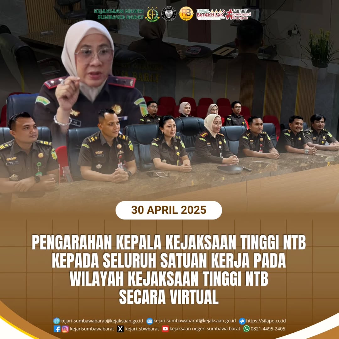 Pada hari Rabu, 30 April 2025. Kepala Kejaksaan Negeri Sumbawa Barat, Dr. Titin Herawati Utara, SH.,MH beserta seluruh jajaran mengikuti pengarahan Kepala Kejaksaan Tinggi NTB terkait peningkatan kedisplinan dalam pelaksanaan kinerja disetiap bidang tugas yang ada di Nusa Tenggara Barat. Pengarahan tersebut diikuti oleh seluruh Kejaksaan Negeri Se-Wilayah NTB