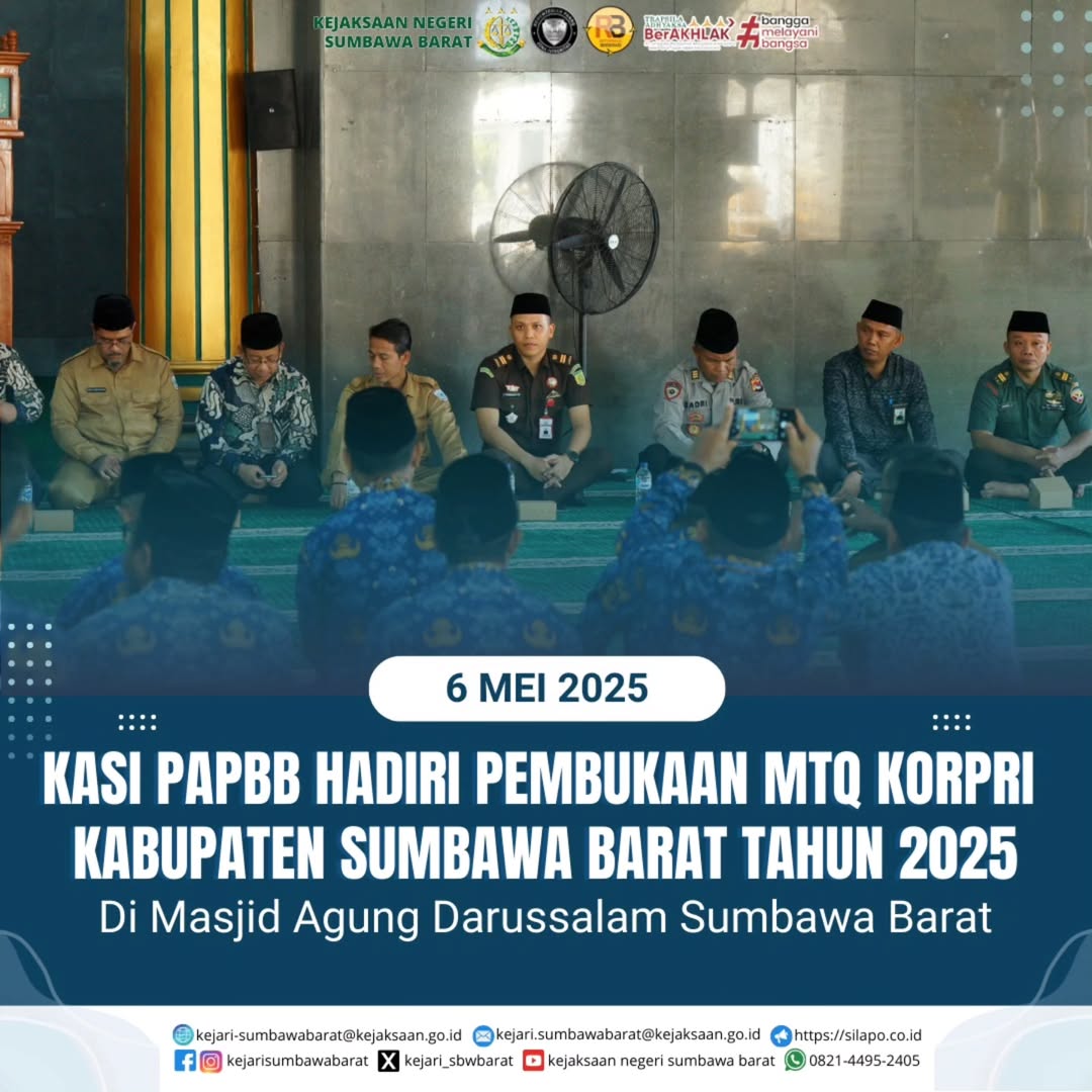 Pada hari Selasa, 06 Mei 2025. Kepala Seksi PAPBB, Andri Setiawan, SH mewakili Kepala Kejaksaan Negeri Sumbawa Barat menghadiri acara pembukaan MTQ KORPRI Kabupaten Sumbawa Barat tahun 2025 bertempat di Masjid Agung Darussalam-KTC.
