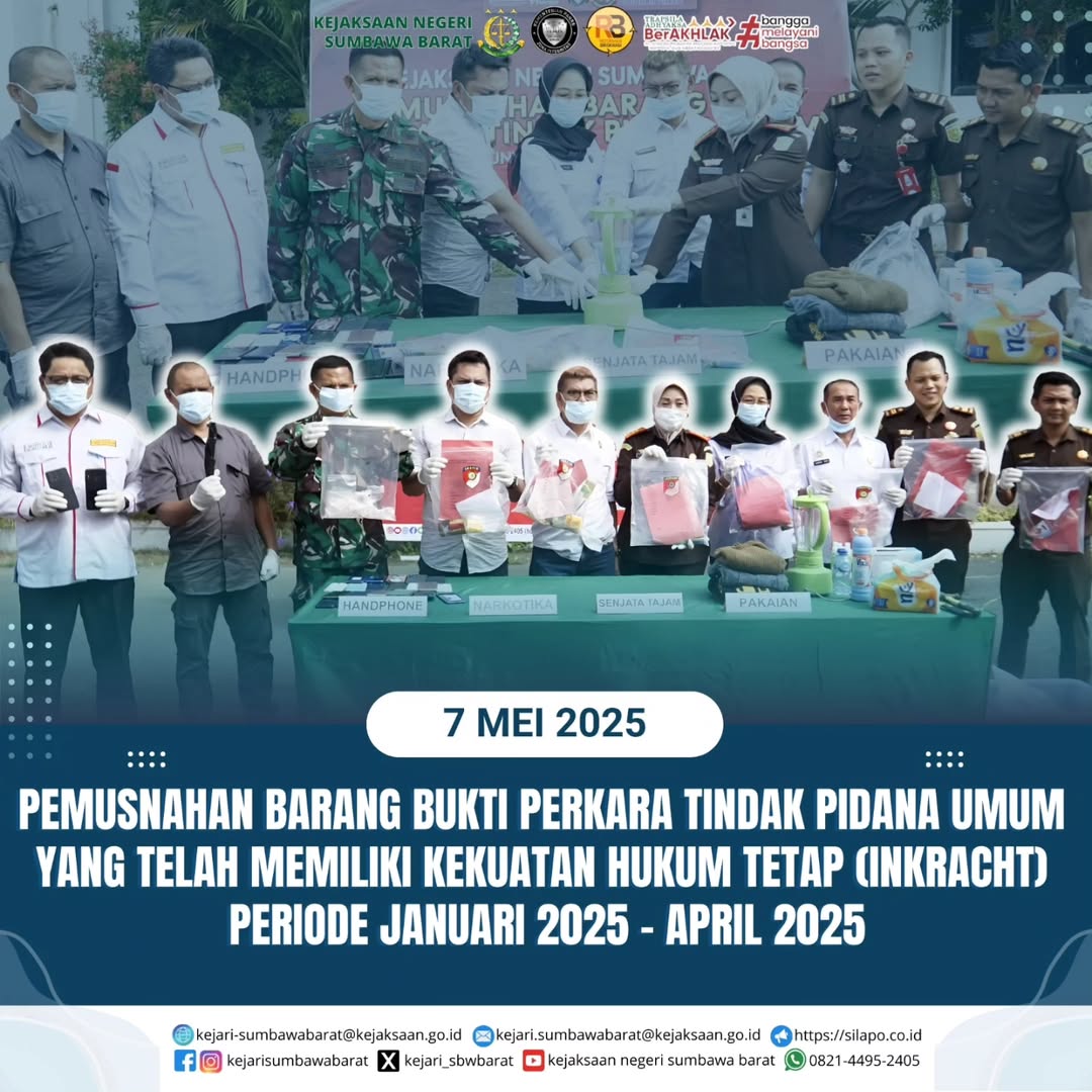Pada Hari Rabu, 07 Mei 2025. Kejaksaan Negeri Sumbawa Barat melaksanakan pemusnahan barang bukti perkara tindak pidana umum yang telah berkekuatan hukum tetap (inkracht), bertempat di Halaman Kantor Kejaksaan Negeri Sumbawa Barat. Barang bukti yang dimusnahkan berasal dari 39 perkara yang telah inkracht selama periode Januari hingga April 2025. Rinciannya mencakup 26 perkara narkotika, 1 perkara orang dan harta benda (Oharda), serta 12 perkara keamanan dan ketertiban umum (Kamtibum). Dalam kegiatan tersebut turut hadir antara lain Kepala BNN Kabupaten Sumbawa Barat, Kepala Badan Kesbangpol, perwakilan Kodim 1628/Sumbawa Barat, perwakilan Polres…