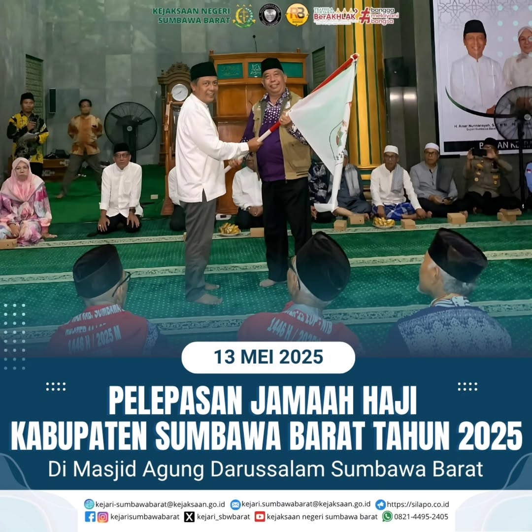 Pada hari Selasa, 13 Mei 2025. Kepala Kejaksaan Negeri Sumbawa Barat dalam hal ini di wakili oleh Jaksa Fungsional Pahrul Taufik Dalimunthe, SH menghadiri kegiatan pelepasan Jamaah Haji Kabupaten Sumbawa Barat yang dilaksanakan di Masjid Agung Darussalam KTC. Terdapat 125 Jamaah Haji yang dilepas langsung oleh Bupati Sumbawa Barat Bapak H. Amar Nurmansyah, ST,. M.Si. dan disaksikan oleh Forkopimda dan tamu lainnya.