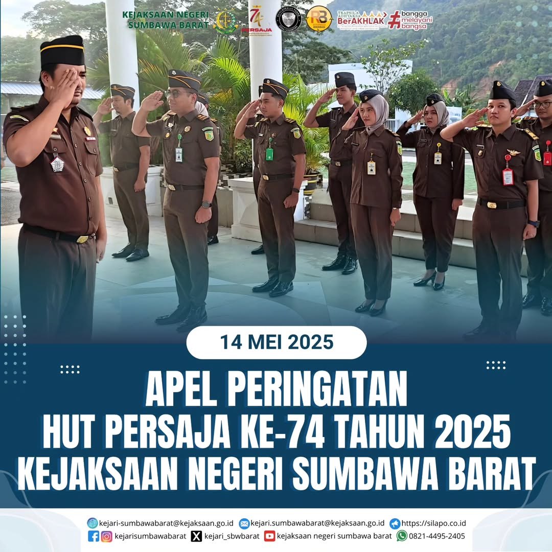 Pada hari Rabu, 14 Mei 2025.Kejaksaan Negeri Sumbawa Barat melaksanakan Apel Peringatan Hari Ulang Tahun Persatuan Jaksa (PERSAJA) KE-74 tahun 2025 yang dilaksanakan di Aula Lt. 1 Gedung Kejaksaan Negeri Sumbawa Barat. Kepala Kejaksaan Negeri Sumbawa Barat dalam hal ini diwakili oleh Kasi Perdata dan Tata Usaha Negara Bapak Reza Safetsila Yusa, SH yang bertindak selaku pembina Apel.