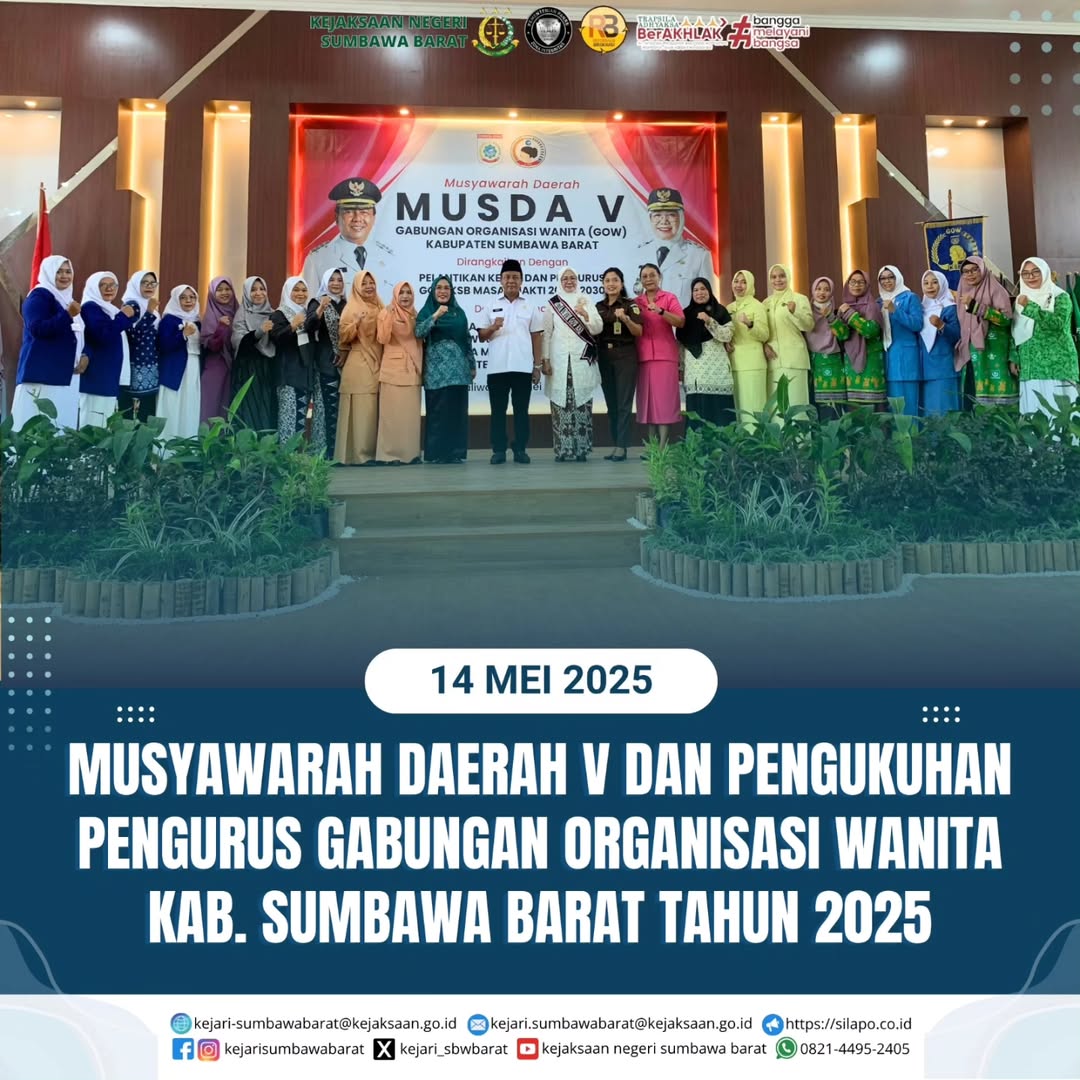Pada hari Rabu, 14 Mei 2025.Kepala Kejaksaan Negeri Sumbawa Barat dalam hal ini diwakili oleh Kepala Subbagian Pembinaan Ibu Ida Ayu Putu Camundi Dewi, SH menghadiri kegiatan Musyawarah Daerah V dan Pengukuhan Pengurus Gabungan Organisasi Wanita (GOW) Kab. Sumbawa Barat Tahun 2025 yang dilaksanakan di Lt. 3 Gedung Sekretariat Daerah Kab. Sumbawa Barat. Bahwa dalam kegiatan tersebut Ketua terpilih GOW Kab. Sumbawa Barat periode 2025 – 2030 yaitu ibu Hj. Hanipa, S.Pt,. M.Inov yang dilantik langsung oleh Bupati Sumbawa Barat Bapak H. Amar Nurmansyah, ST,. M.Si.