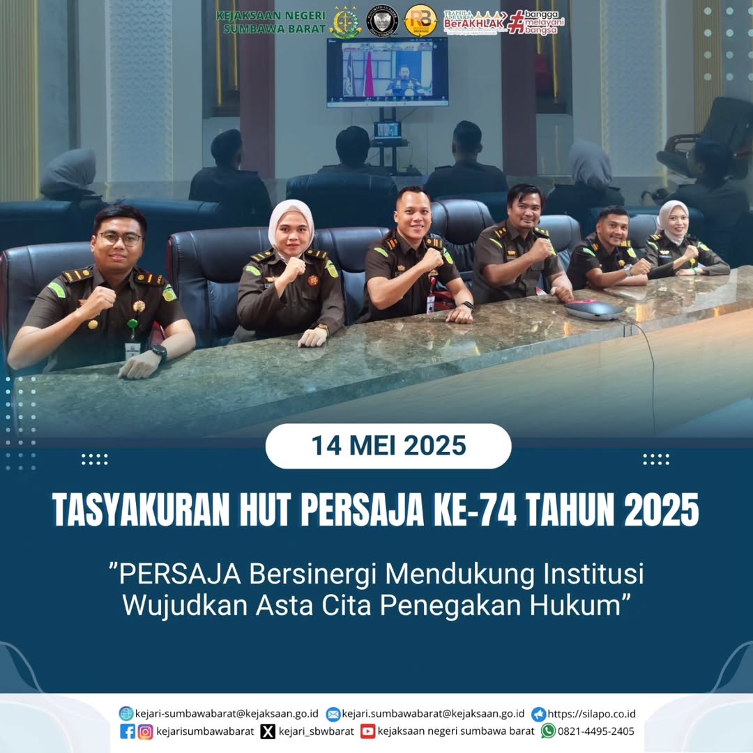 Pada hari Rabu, 14 Mei 2025.Kejaksaan Negeri Sumbawa Barat melaksanakan Tasyakuran dalam memperingati HUT Pesatuan Jaksa (PERSAJA) Ke-74 Tahun 2025 yang diselenggarakan secara daring dan luring dan serentak Se-Indonesia; Pelaksanaan Tasyakuran dipimpin langsung oleh Jaksa Agung RI Bapak ST. Burhanuddin pada Lt. 11 Gedung Kejaksaan RI dan para Jaksa pada Kejaksaan Negeri Sumbawa Barat mengikuti kegiatan tersebut secara zoom di Aula Cinematik Kejari Sumbawa Barat
