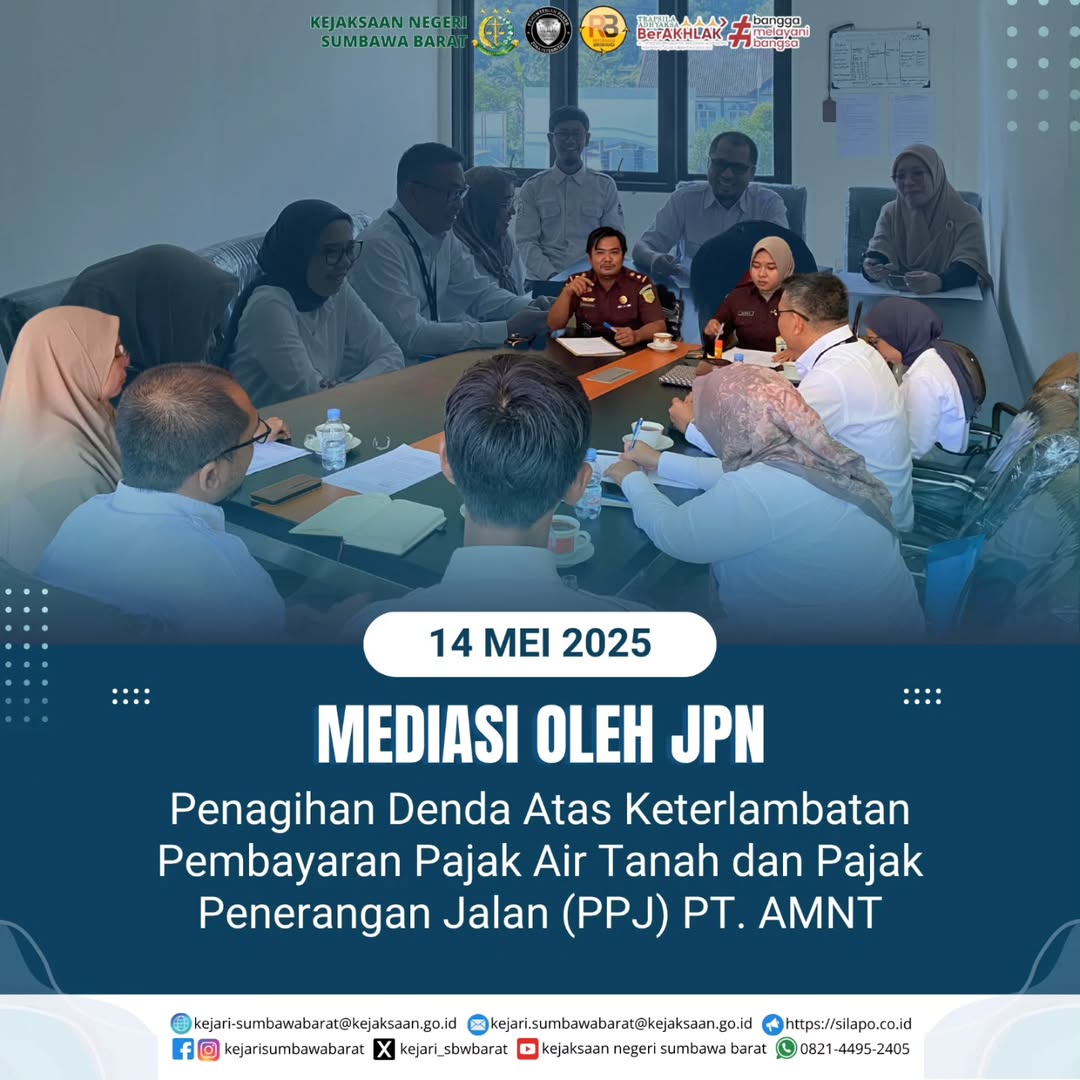 Pada hari Rabu, 14 Mei 2025.Kejaksaan Negeri Sumbawa Barat melalui Jaksa Pengacara Negara (JPN) telah melaksanakan Mediasi atas Permohonan Bantuan Hukum dari Badan Pendapatan Daerah Kabupaten Sumbawa Barat atas Penagihan Denda Atas Keterlambatan Pembayaran Pajak Air Tanah dan Pajak Penerangan Jalan (PPJ) yang dipimpin langsung oleh Kasi Perdata dan TUN Kejari Sumbawa Barat Bapak Reza Safetsila Yusa, SH dan tim JPN yang bertempat di Ruang Rapat JPN Kejari Sumbawa Barat.