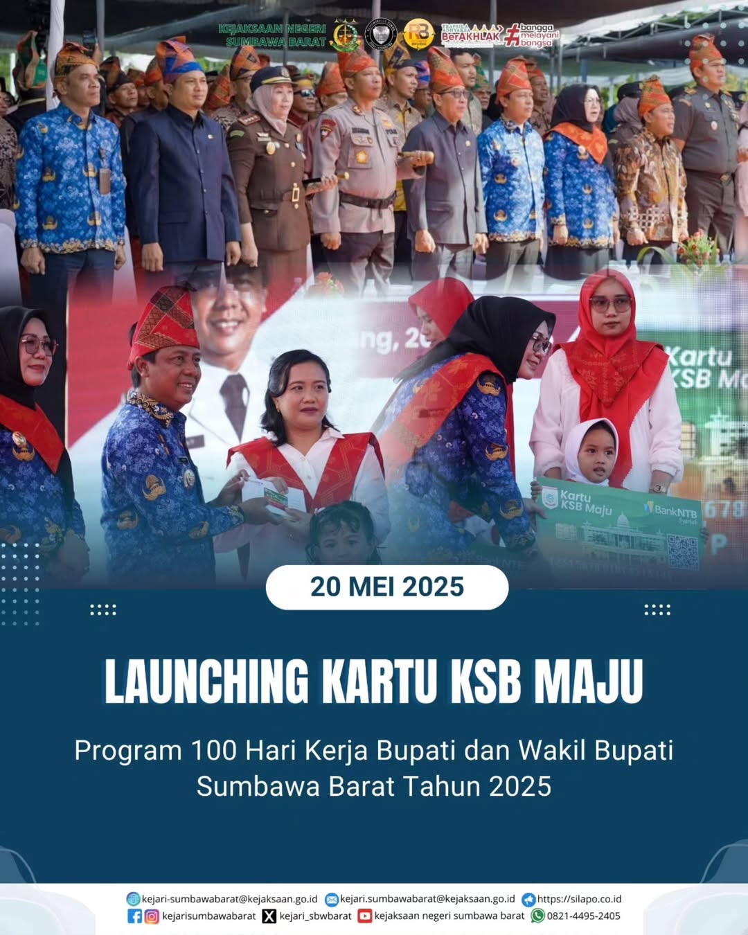 Pada hari Selasa, 20 Mei 2025. Kepala Kejaksaan Negeri Sumbawa Barat, Dr. Titin Herawati Utara, SH.,MH menghadiri acara launching program “Kartu KSB Maju” yang merupakan program 100 hari kerja Bupati dan Wakil Bupati Sumbawa Barat. Kegiatan tersebut dilaksanakan di Lapangan Graha Fitrah Komplek KTC.