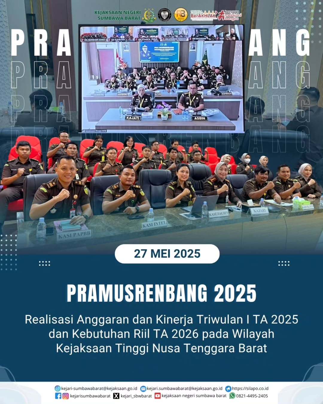 Pada hari Selasa, 27 Mei 2025. Kepala Kejaksaan Negeri Sumbawa Barat, Dr. Titin Herawati Utara, SH.,MH bersama seluruh jajaran mengikuti Pramusrenbang secara yang diikuti oleh seluruh satuan kerja se-wilayah NTB, dari Pra Musrenbang nantinya akan terintegrasi dalam penyusunan rencana kerja dan anggaran serta capaian kinerja yang hendak dicapai sesuai visi misi Kejaksaan RI.