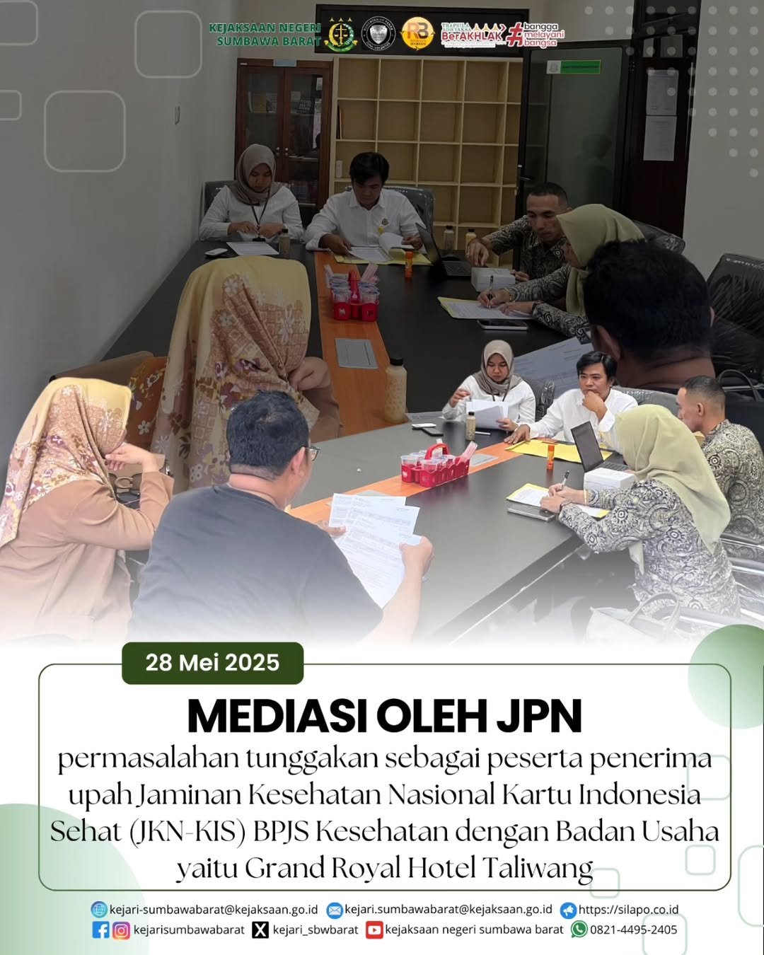Pada hari Rabu, 28 Mei 2025. Bertempat di Ruang Rapat JPN telah dilaksanakan Mediasi atas Permohonan Bantuan Hukum dari BPJS Kesehatan Kantor Taliwang atas permasalahan tunggakan sebagai peserta penerima upah Jaminan Kesehatan Nasional Kartu Indonesia Sehat (JKN-KIS) BPJS Kesehatan dengan Badan Usaha yaitu Grand Royal Hotel Taliwang.