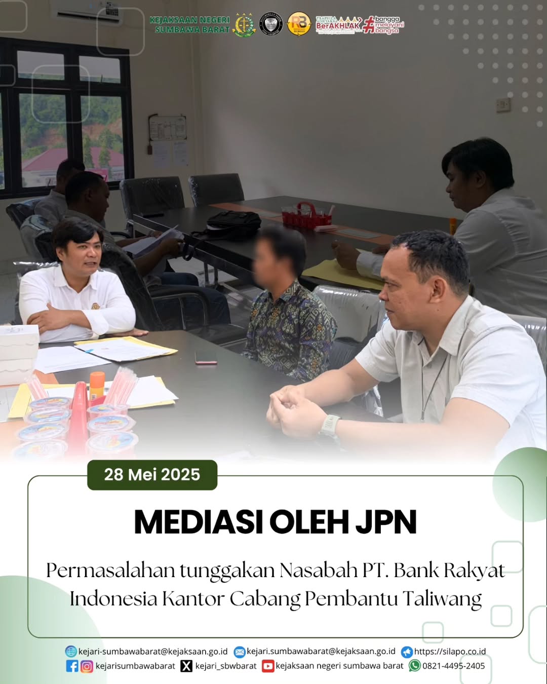 Pada hari Rabu, 28 Mei 2025. Bertempat di Ruang Rapat JPN telah dilaksanakan Mediasi atas Permohonan Bantuan Hukum dari PT. Bank Rakyat Indonesia Kantor Cabang Pembantu Taliwang atas permasalahan tunggakan nasabah.