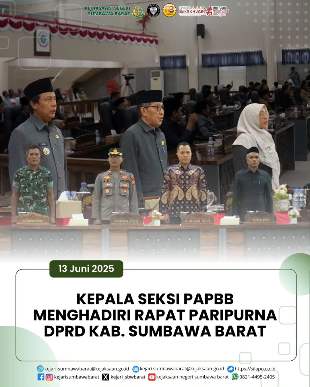 Pada hari Jumat, 13 Juni 2025. Kajari Sumbawa Barat diwakili Kasi PAPBB Bapak Andri Setiawan, S.H menghadiri Rapat Paripurna DPRD bertempat di Ruang Rapat Paripurna DPRD Sumbawa Barat.