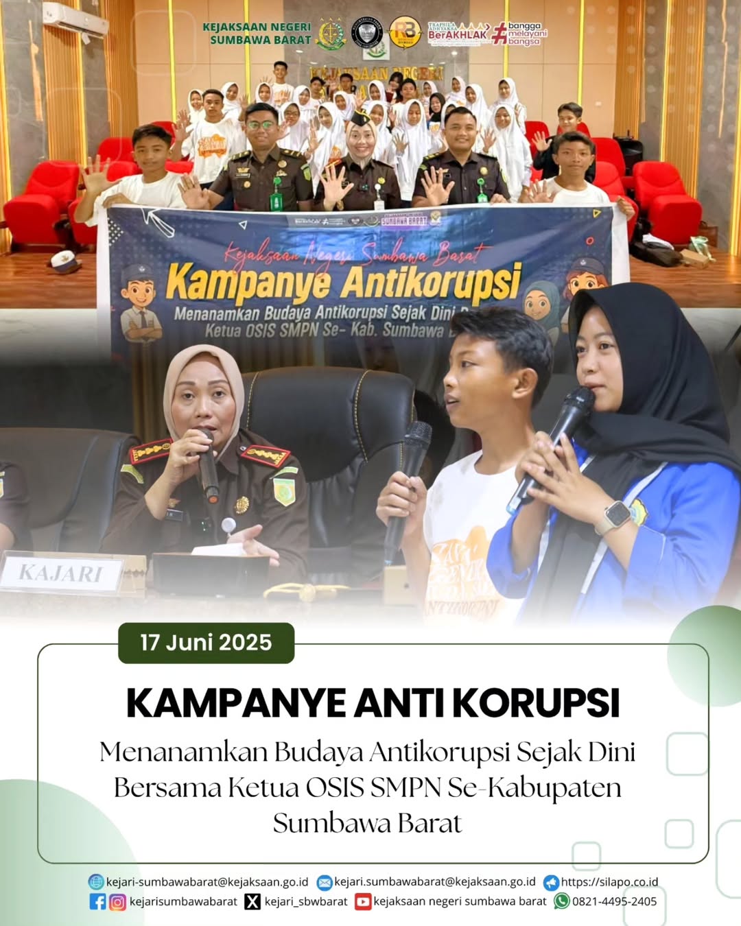 Pada hari Selaaa, 17 Juni 2025. Kejaksaan Negeri Sumbawa Barat dalam melakukan usaha preventif dalam menanggunangi prilaku KKN, melaksanakan kegiatan Kampanye Antikorupsi dengan Tema “Menanamkan Budaya Antikorupsi Sejak Dini” Bersama Ketua OSIS SMPN Se-kab. Sumbawa Barat yang dilaksanakan di Kantor Kejaksaan Negeri Sumbawa Barat. Kepala Kejaksaan Negeri Sumbawa Barat Dr. Titin Herawati Utara, SH., MH. didampingi oleh Kasi Intelijen Benny Utama, SH bersama tim melaksanakan kegiatan tersebut dengan dihadiri oleh 26 Siswa/i perwakilan dari setiap sekolah SMPN yang berada di Kab. Sumbawa Barat.