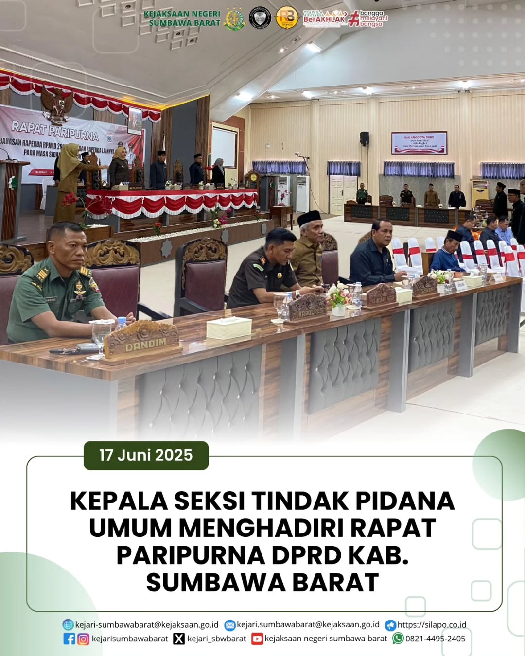 Pada hari Selasa, 17 Juni 2025. Kepala Seksi Tindak Pidana Umum, Rizki Taufani, SH mewakili Kepala Kejaksaan Negeri Sumbawa Barat menghadiri rapat paripurna DPRD Kabupaten Sumbawa Barat.