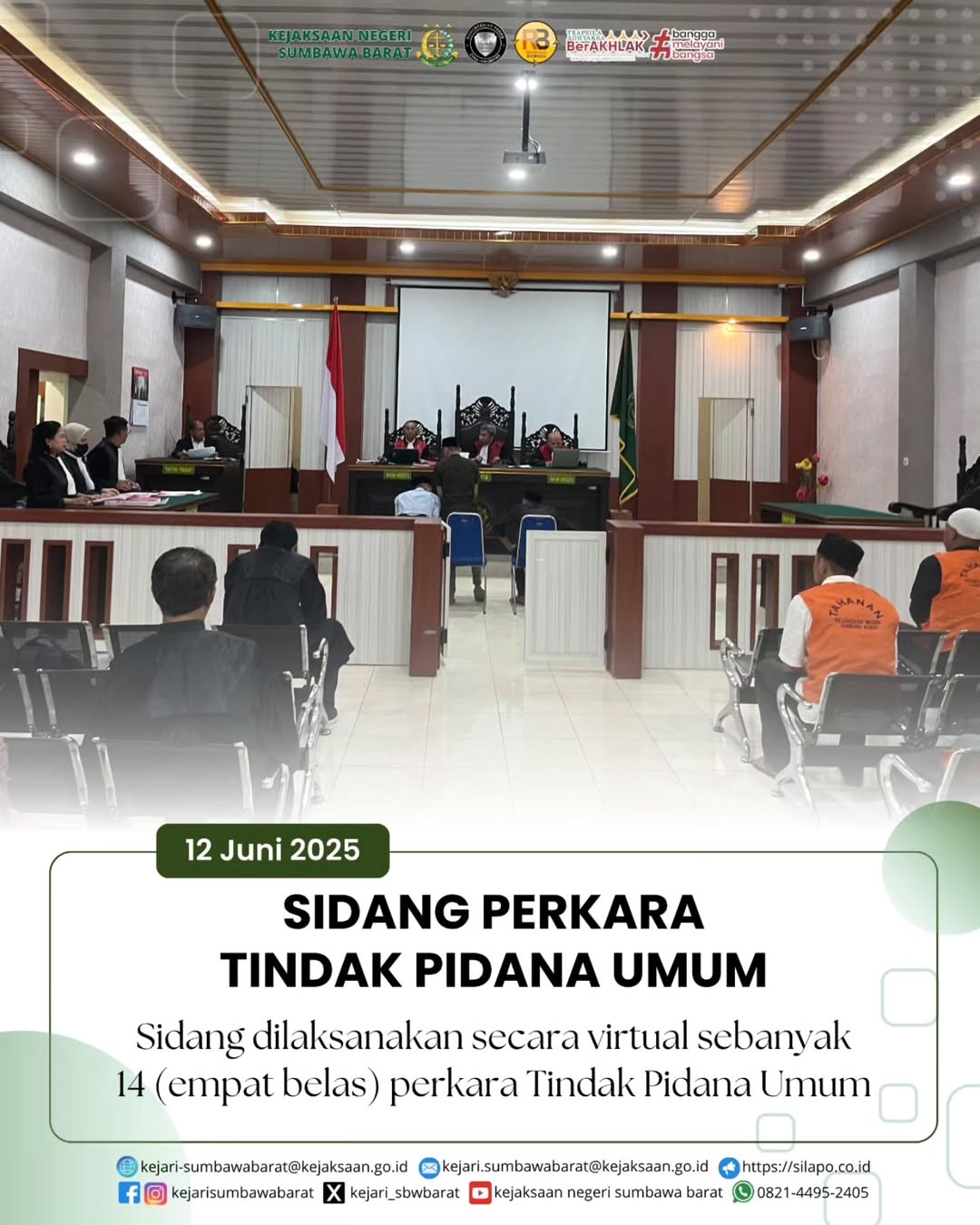 Pada hari Kamis, 12 Juni 2025. JPU pada Kejaksaan Negeri Sumbawa Barat melaksanakan sidang tindak pidana umum sebanyak 14 (empat belas) perkara bertempat di Pengadilan Negeri Sumbawa Besar.