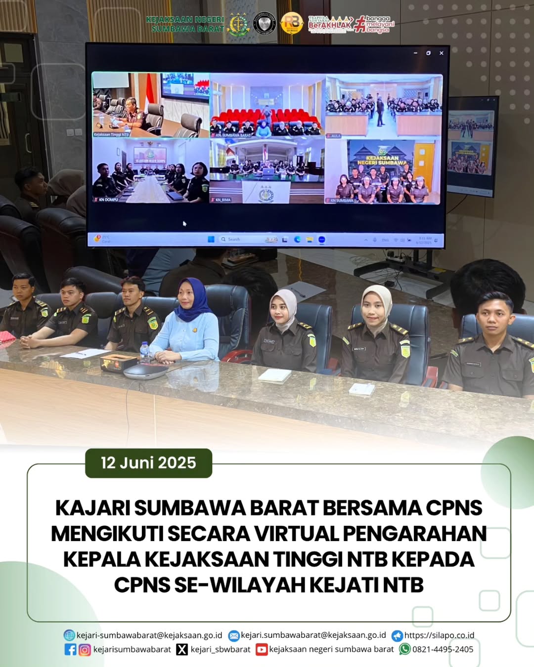 Pada hari Kamis, 12 Juni 2025. Kepala Kejaksaan Negeri Sumbawa Barat, Dr. Titin Herawati Utara, SH.,MH bersama CPNS mengikuti pengarahan Kepala Kejaksaan Tinggi NTB kepada CPNS se-wilayah hukum Kejaksaan Tinggi NTB secara virtual. Dalam sambutannya, Kepala Kejaksaan Tinggi NTB menyampaikan selamat datang kepada seluruh CPNS dan mengucapkan selamat bergabung dalam keluarga besar Korps Adhyaksa. Beliau menekankan pentingnya menjaga integritas, profesionalisme, dan etika, baik dalam pelaksanaan tugas sehari-hari maupun dalam kehidupan bermasyarakat, termasuk dalam penggunaan media sosial.