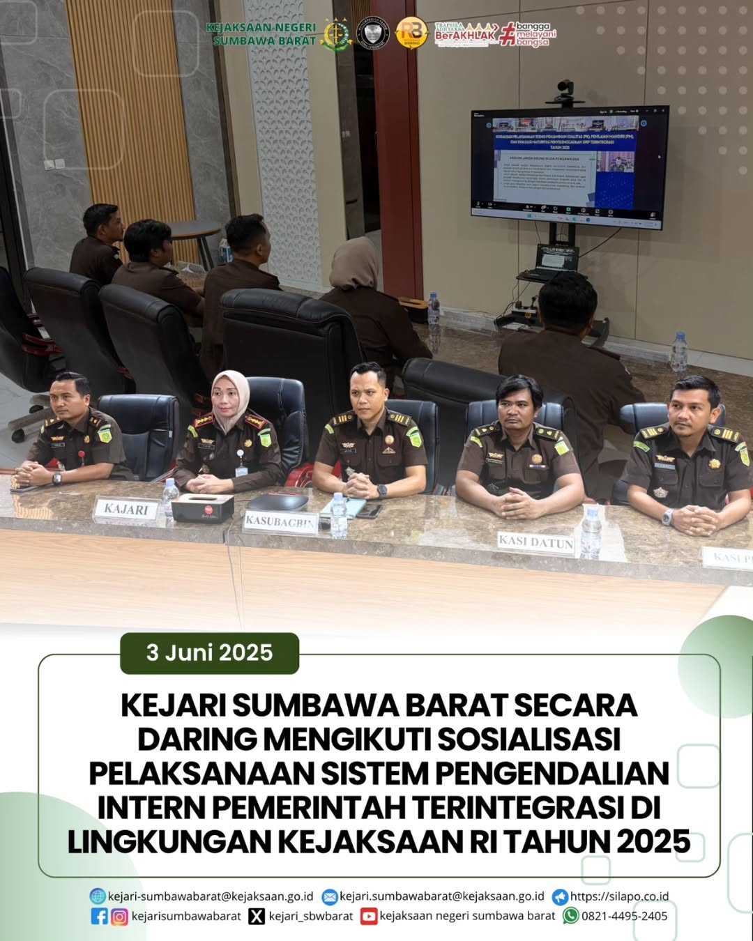 Pada hari Selasa, 03 Juni 2025. Kepala Kejaksaan Negeri Sumbawa Barat, Dr. Titin Herawati Utara, SH.,MH beserta seluruh jajaran mengikuti sosialisasi pelaksanaan sistem pengendalian intern pemerintah terintegrasi di Lingkungan Kejaksaan RI tahun 2025 secara daring.