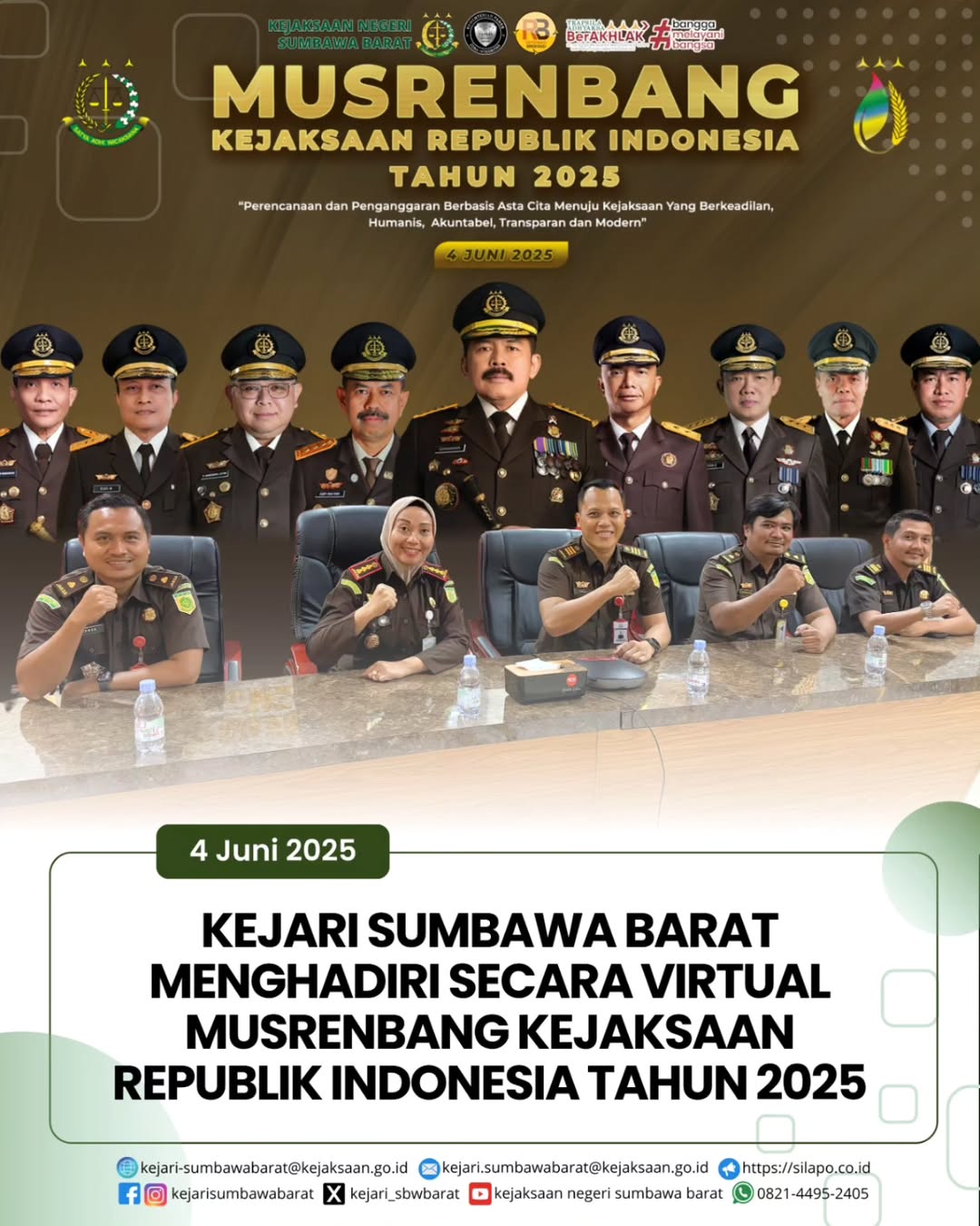 Pada hari Rabu, 04 Juni 2025. Kepala Kejaksaan Negeri Sumbawa Barat bersama jajaran mengikuti Musrenbang Kejaksaan Negeri Sumbawa Barat Tahun 2025 secara daring bertempat di Ruang Vidcon Kejari Sumbawa Barat.