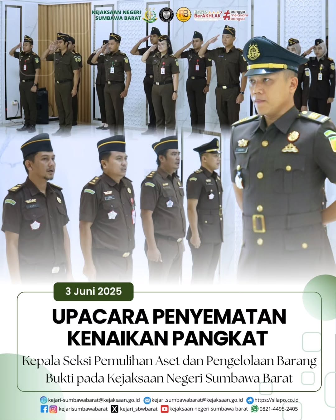 Pada Hari Selasa, 03 Juni 2025. Kepala Kejaksaan Negeri Sumbawa Barat, Dr. Titin Herawati Utara, SH.,MH memimpin upacara kenaikan pangkat Kepala Seksi Pengelola Aset dan Pemusnahan Barang Bukti, Andri Setiawan, SH setingkat lebih tinggi turut hadi Para Kasi dan Seluruh Pegawai bertempat di Aula Kejaksaan Negeri Sumbawa Barat.