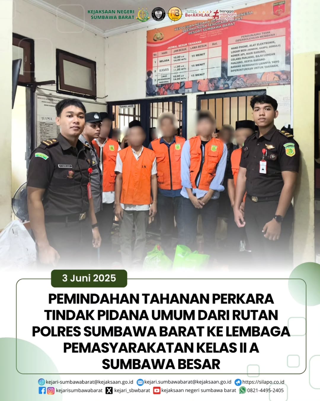 Pada hari Selasa, 03 Juni 2025. Bidang tindak pidana umum Kejari Sumbawa Barat melakukan pemindahan tahanan dari Rutan Polres Sumbawa Barat Ke Lembaga Pemasyarakatan Kelas II A Sumbawa Besar. Proses pemindahan berjalan lancar dengan pengawalan dan pengamanan ketat dari pihak kepolisian. Sebanyak 5 (lima) orang tahanan kini menjalani proses hukum lebih lanjut.