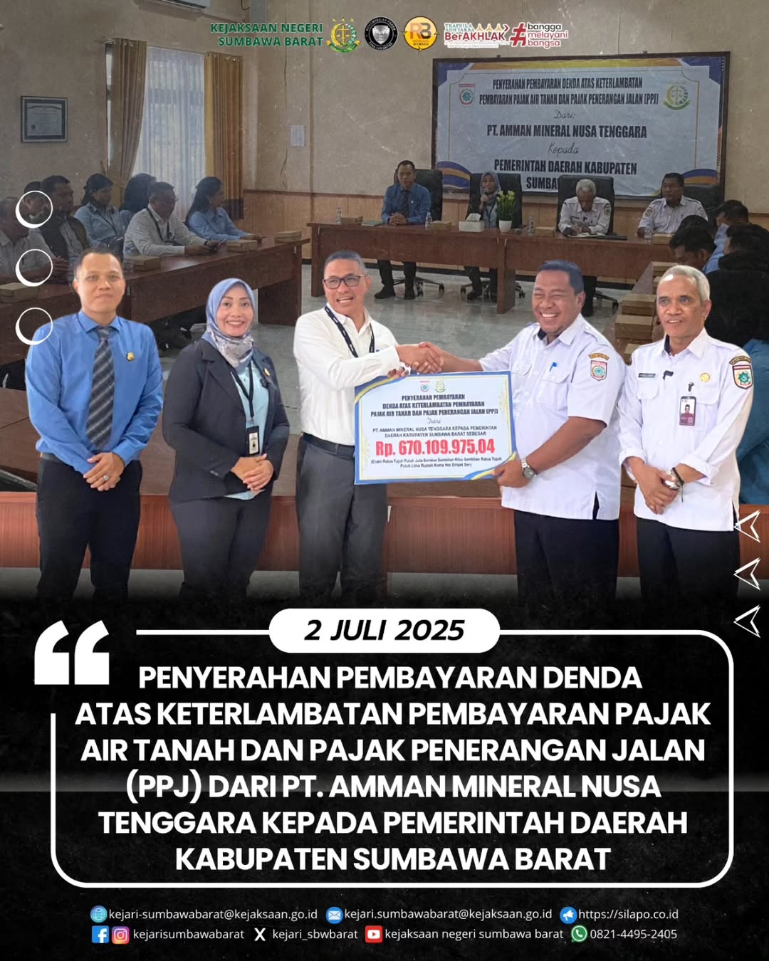 Pada hari Rabu, 02 Juli 2025. Bertempat di Aula Kejaksaan Negeri Sumbawa Barat dilaksanakan penyerahan secara simbolis denda atas keterlambatan pembayaran Pajak Air Tanah dan Pajak Penerangan Jalan (PPJ) dari PT Amman Mineral Nusa Tenggara (PT AMNT) dengan total nilai mencapai Rp 670.109.975,04 (enam ratus tujuh puluh juta seratus sembilan ribu sembilan ratus tujuh puluh lima rupiah koma nol empat sen). Berdasarkan Surat Kuasa Khusus (SKK) Nomor 900.1.3.2/01/SKK/III/2025 tertanggal 13 Maret 2025 yang dikeluarkan oleh Bapenda KSB. Kejaksaan Negeri Sumbawa Barat sebagai Jaksa Pengacara Negara (JPN) melakukan tindakan hukum non-litigasi…