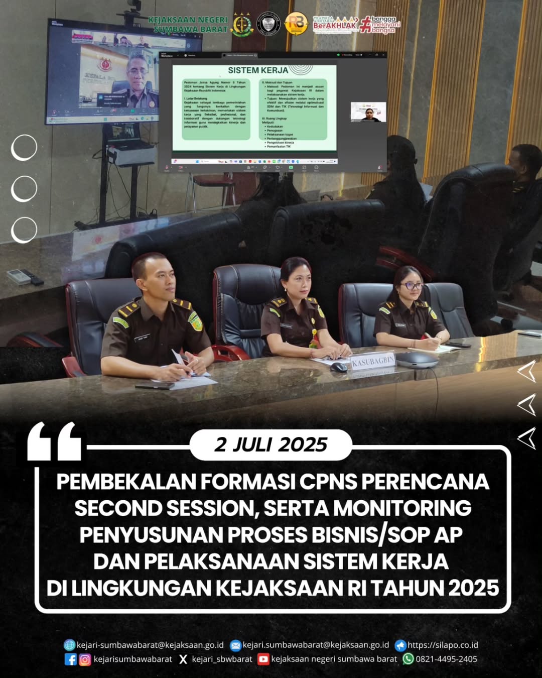 Pada hari Rabu, 02 Juli 2025. Kepala Subbagian Pembinaan bersama CPNS formasi perencana mengikuti video conference dalam rangka Pembekalan Formasi CPNS Perencana Second Session, serta Monitoring Penyusunan Proses Bisnis/SOP AP dan Pelaksanaan Sistem Kerja di Lingkungan Kejaksaan RI Tahun 2025.