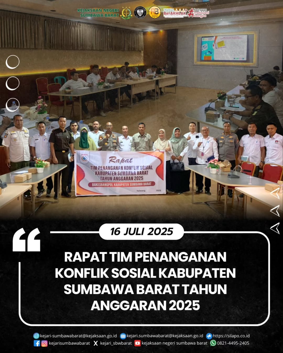 Pada hari Rabu, 16 Juli 2025. Rapat tim penanganan konflik sosial kabupaten Sumbawa Barat Tahun Anggaran 2025 dengan agenda antisipasi dampak dinamika global bertempat di Ruang Sidang I Sekretariat Daerah Kab. Sumbawa Barat.