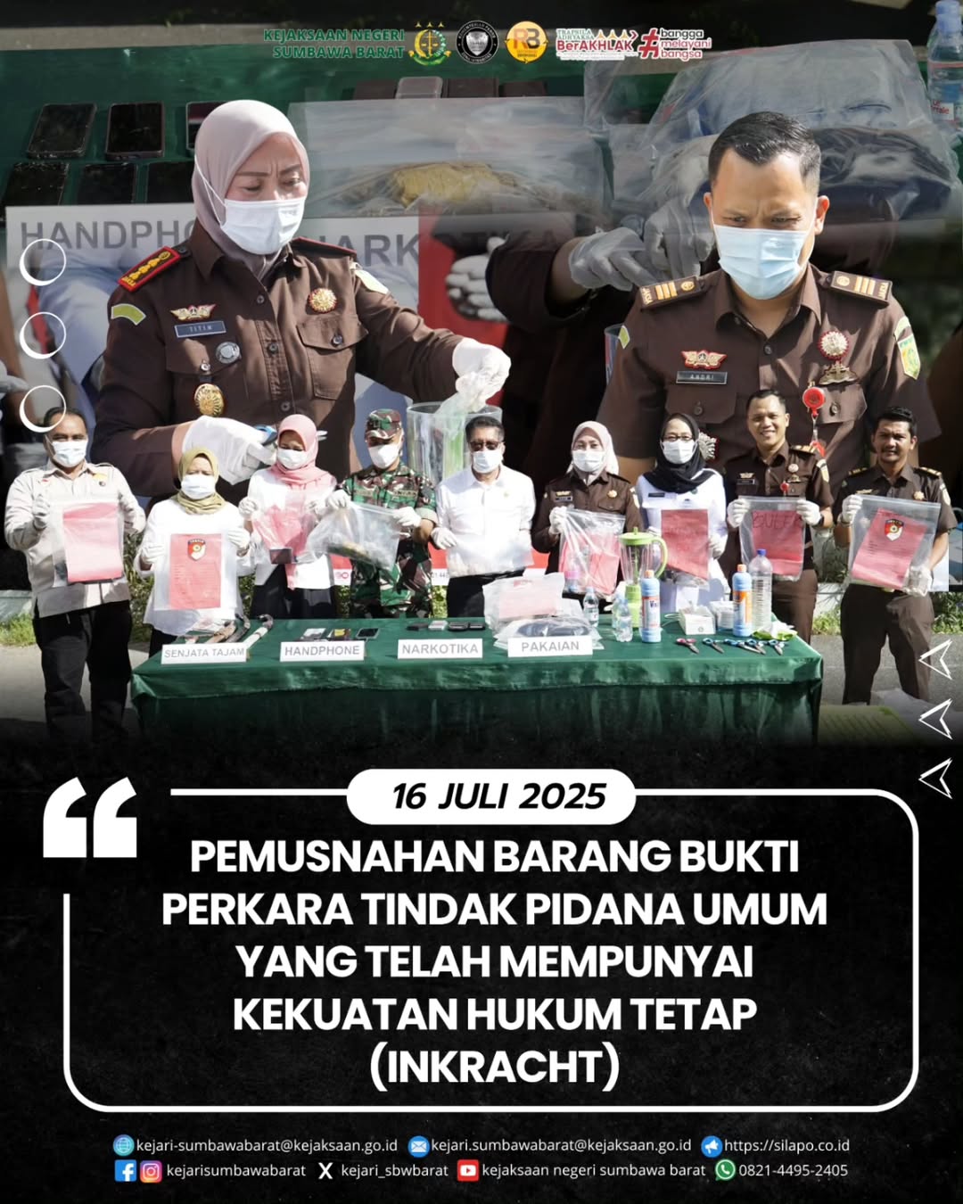 Pada hari Rabu,16 Juli 2025. Kejaksaan Negeri Sumbawa Barat melakukan pemusnahan barang bukti tindak pidana umum yang telah berkekuatan hukum tetap bertempat di Halaman Kantor Kejari Sumbawa Barat.Adapun brang bukti yang dimusnahkan berupa Narkotika jenis sabu sebanyak 27,73 gram, jenis ganja sebanyak 89,46 gram,Handphone 7 unit,Senjata Tajam 4 buah dan barang bukti 17 potong pakaian, dan barang bukti lainnya.