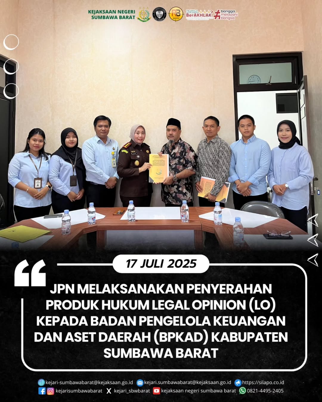 Pada hari Rabu, 16 Juli 2025. Kepala kejaksaan Negeri sumbawa Barat, Dr.Titin Herawati Utara,SH., MH didampingi JPN Kejari sumbawa Barat menyerahkan produk hukum Legal Opinion (LO) kepada Badan Pengelola Keuangan can Aset Daerah (BPKAD) Kabupaten Sumbawa Barat.