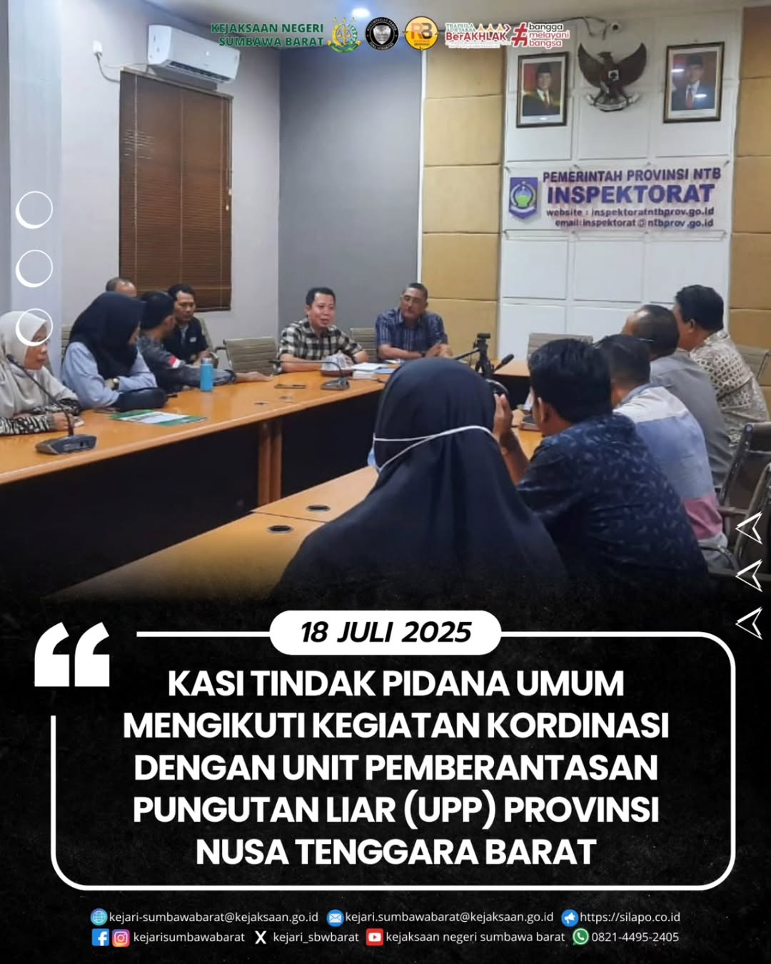 Pada hari Jum’at, 18 Juli 2025 Kepala seksi tindak pidana umum, Rizki Taufani,SHmewakili kepala kejaksaan Negeri Sumbawa Barat menghadiri kegiatan koordinasi dengan unit pemberantasan pungutan liar (UPP) provinsi Nusa Tenggara Barat