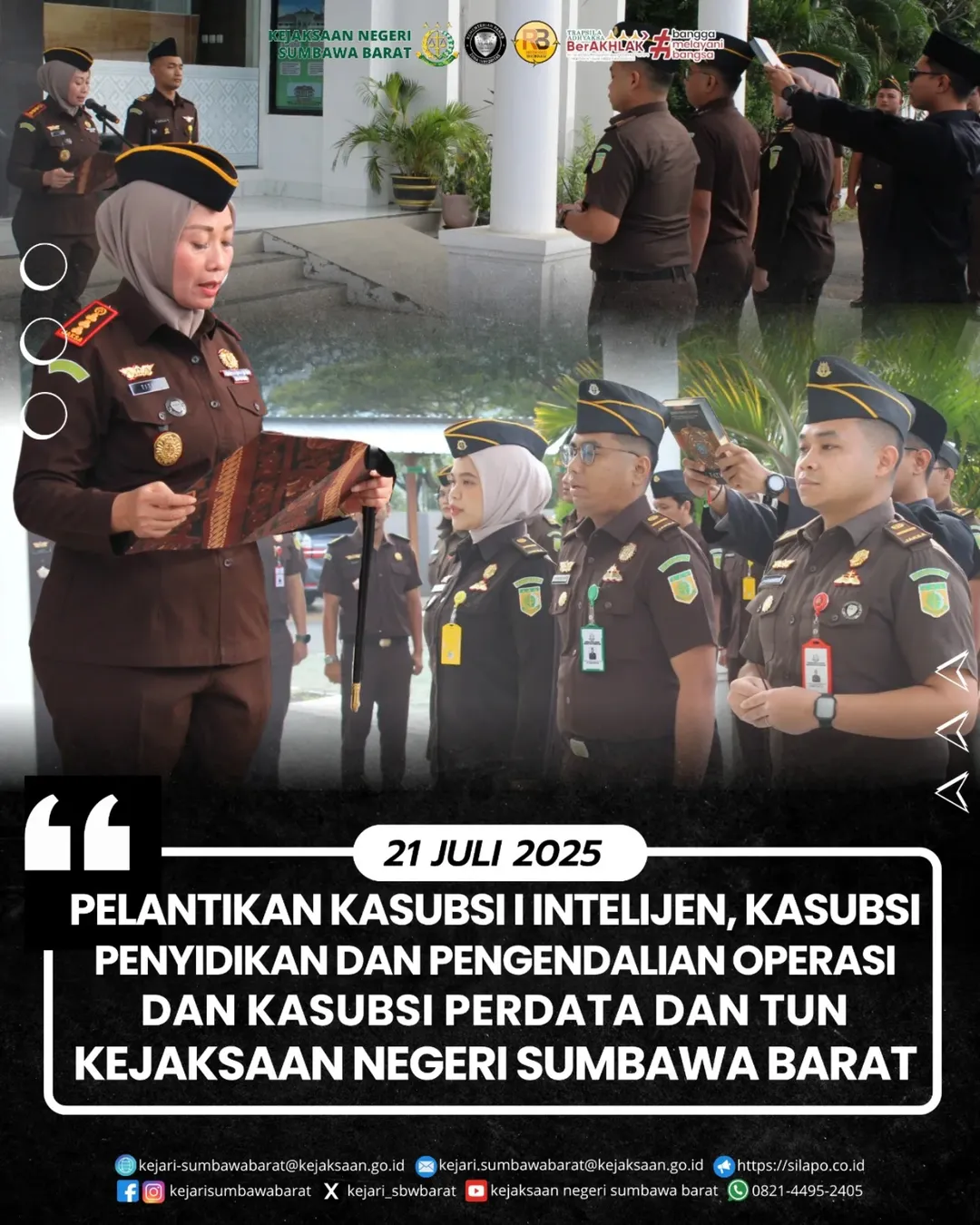 Pada hari Senin, 21 Juli 2025. telah dilaksanakan pelantikan Kasubsi yaitu:– Kasubsi I, Pahrul Taufik Dalimuthe, SH– Kasubsi Penyidikan dan Pengendalian Operasi, Kadek Yogi Barhaspati, SH– Kasubsi Perdata dan Tata Usaha Negara, Ridha Rachma, SH pelantikan dipimpin langsung oleh Kepala Kejaksaan Negeri Sumbawa Barat, Dr. Titin Herawati Utara, SH.,MH dan diikuti oleh Seluruh Pegawai Kejaksaan Negeri Sumbawa Barat.