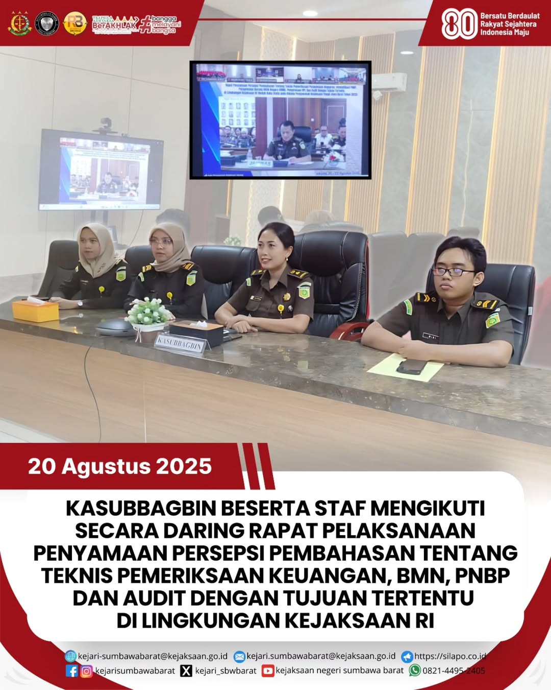Pada hari Rabu, 20 Agustus 2025. Kepala Subbagian Pembinaan Kejari Sumbawa Barat Ida Ayu Putu Camundi Dewi, SH., MH bersama staf mengikuti kegiatan Rapat Pelaksanaan Penyamaan Persepsi Pembahasan Tentang Teknis Pemeriksaan Keuangan, BMN, PNBP Dan Audit dengan tujuan Tertentu di lingkungan Kejaksaan RI yang dilaksanakan secara daring.