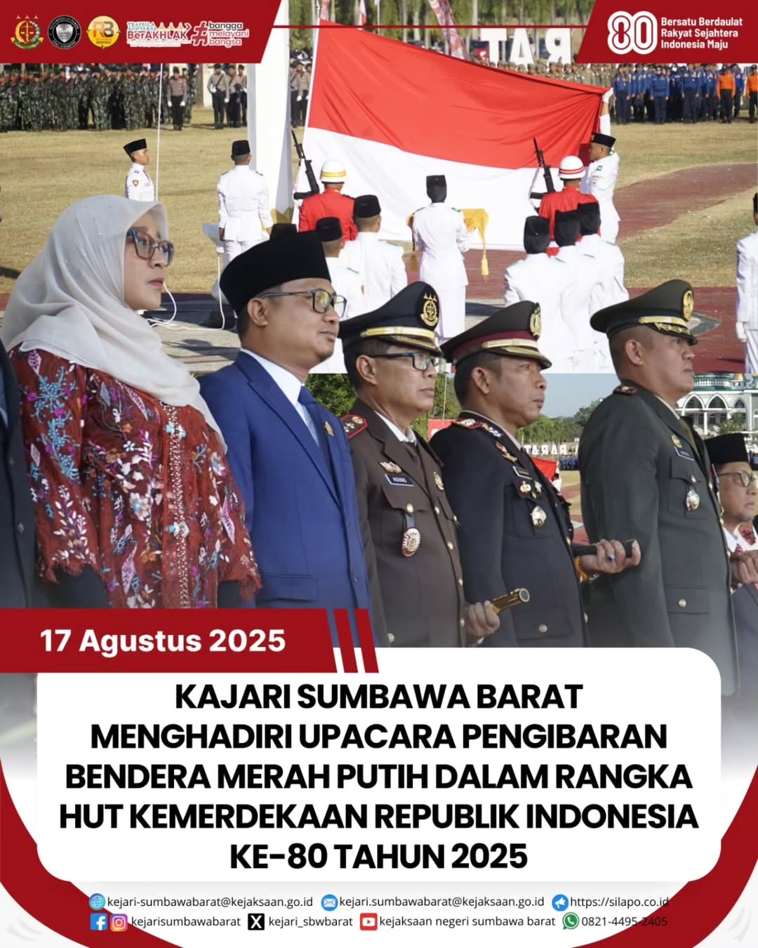 Pada hari Minggu, 17 Agustus 2025. Kepala Kejaksaan Negeri Sumbawa Barat bapak Agung Pamungkas, SH., MH, menghadiri kegiatan upacara pengibaran bendera merah putih dalam rangka HUT Kemerdekaan Republik Indonesia ke-80 Tahun 2025 yang berpusat di Lapangan Graha Fitrah Kemuter Telu Center (KTC) Kec. Taliwang.