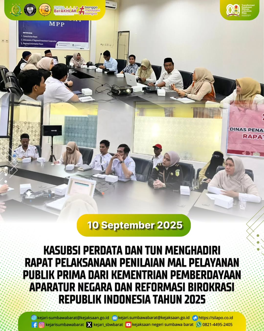 Pada hari Rabu, 10 September 2025. Kepala Kejaksaan Negeri Sumbawa Barat dalam hal ini diwakili oleh Kasubsi Perdata dan TUN Ridha Rachmawati, S.H, menghadiri Rapat terkait Pelaksanaan penilaian Mal Pelayanan Publik Prima di masing-masing Kabupaten/kota dari Kementrian Pemberdayaan Aparatur Negara dan Reformasi Birokrasi Republik Indonesia Tahun 2025 yang berlokasi di Mal Pelayanan Publik/Dinas Penanaman Modal dan Pelayanan Terpadu Satu Pintu Kabupaten Sumbawa Barat. Kegiatan ini guna mengevaluasi kinerja dari Mal Pelayanan Publik dan meminta Setiap gerai pelayanan pada Mall Pelayanan Publik di kabupaten/kota se-Provinsi Nusa Tenggara Barat wajib melakukan pengisian…