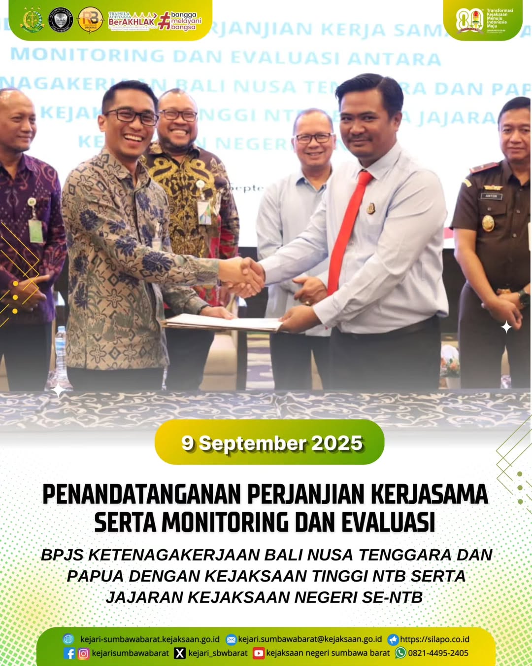 Pada hari Selasa, 9 September 2025. Kepala Kejaksaan Negeri Sumbawa Barat dalam hal ini diwakili oleh Kasi Perdata dan TUN Kejari Sumbawa Barat Reza Safetsila Yusa, SH beserta tim mengikuti kegiatan Penandatanganan Perjanjian Kerjasama Serta. monitoring dan Evaluasi yang dilaksanakan oleh BPJS Ketenagakerjaan Bali Nusa Tenggara dan Papua yang bertempat di Hotel Astoria Mataram. Kegiatan ini diikuti oleh Kejaksaan Tinggi NTB dan Seluruh Kejaksaan Negeri Se-NTB dengan perkiraan jumlah peserta sekitar 50 peserta yang dilaksanakan dari tanggal 9-10 September 2025.