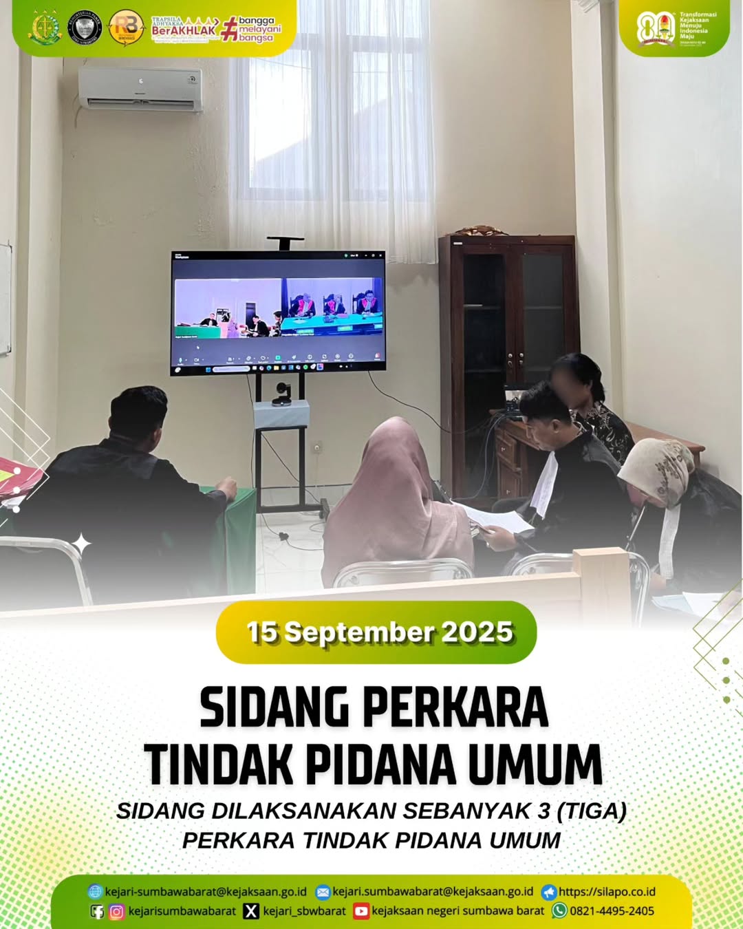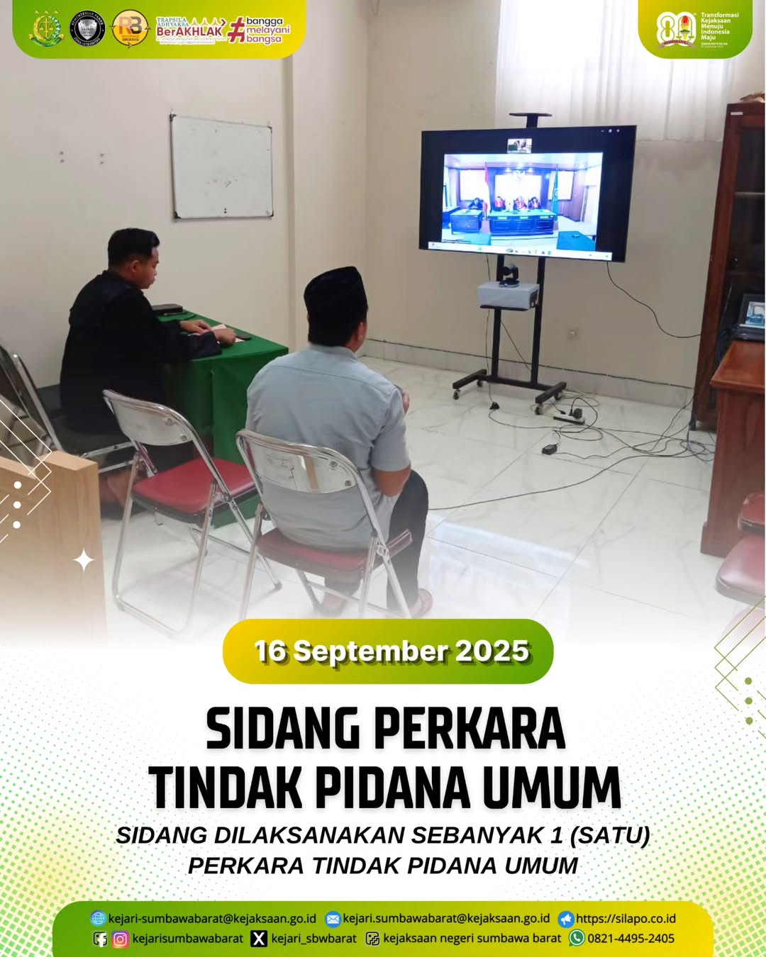 Pada hari Selasa, 16 September 2025. Tim Jaksa pada Kejaksaan Negeri Sumbawa barat melaksanakan Sidang Tindak Pidana Umum yang dipimpin langsung oleh Pengadilan Negeri Sumbawa Besar sebanyak 1 perkara. Tim Jaksa melaksanakan sidang Secara daring melalui Zoom yang dilaksanakan di Kantor Kejari Sumbawa Barat.