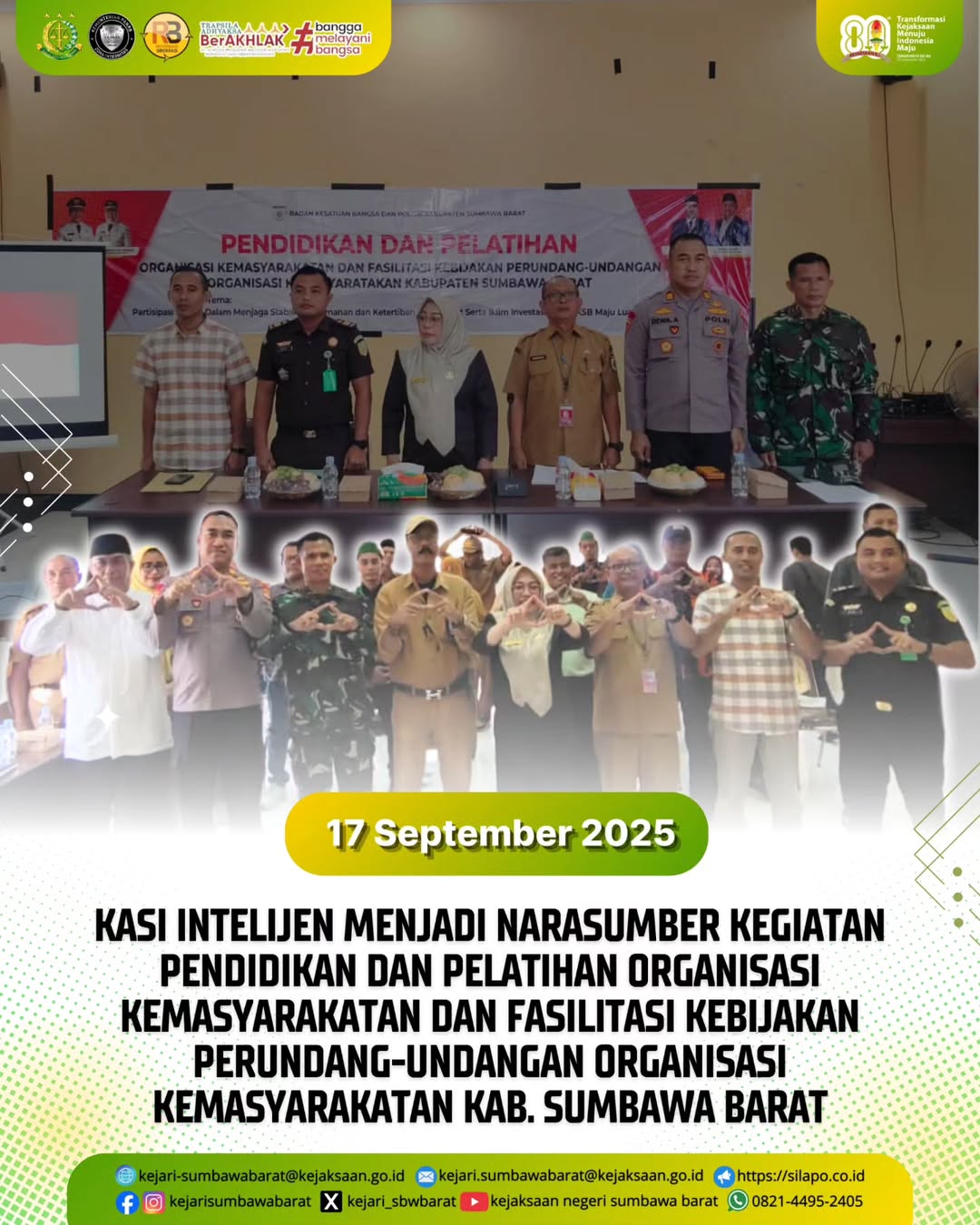 Pada hari Rabu, 17 September 2025. Kasi Intelijen Kejari Sumbawa Barat Benny Utama, SH menjadi Narasumber pada kegiatan Pelatihan Organisasi Kemasyarakatan dan Fasilitasi Kebijakan Perundang-undangan Organisasi Kemasyarakatan Kab. Sumbawa Barat yang dilaksanakan di Aula Kantor BAKESBANGPOL Kab. Sumbawa Barat dengan tema Partisipasi Ormas dalam Menjaga Stabilitas Keamanan dan Ketertiban Masyarakat serta Iklim Investasi Untuk KSB Maju Luar Biasa. Bahwa yang hadir dalam kegiatan ini berasal dari Berbagai bidang baik dari OPD terkait, Instansi Pemerintah Pusat dan daei berbagai Organisasi Kemasyarakatan yang ada di Kab. Sumbawa Barat. Kegiatan ini bertujuan sebagai…