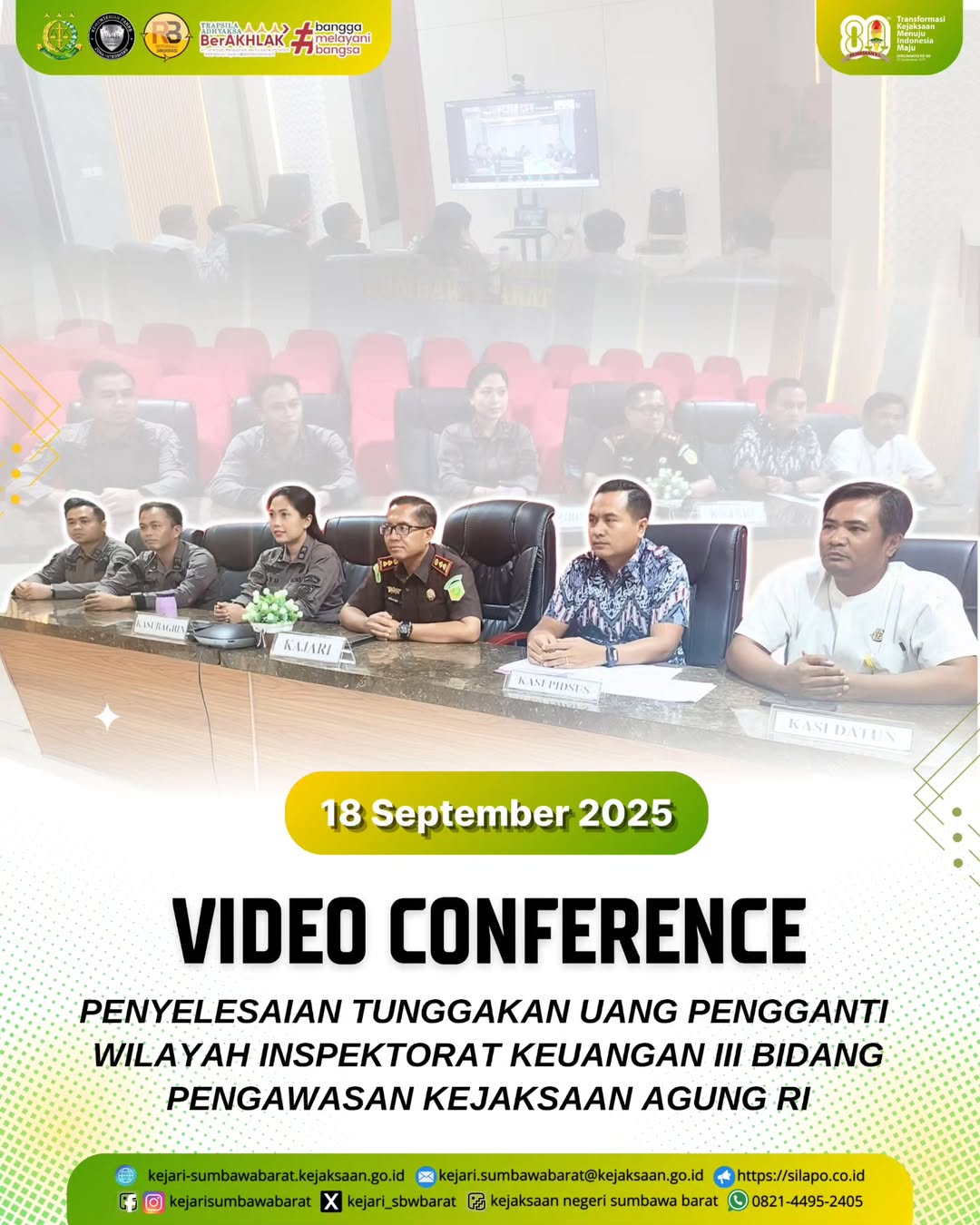 Pada hari Kamis, 18 September 2025. Kepala Kejaksaan Negeri Sumbawa Barat Bapak Agung Pamungkas, SH., MH beserta Kasubbagbin dan para kasi melakukan kegiatan Video Conference terkait Penyelesaian Tunggakan Uang Pengganti Wilayah Inspektorat Keuangan III bidang Pengawasan Kejaksaan Agung RI yang dilaksanakan di Ruang Video Cinematic Lt. 1 Gedung Kejari Sumbawa Barat