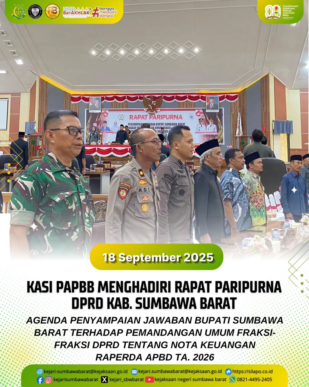 Pada hari Kamis, 18 September 2025. Kepala Kejaksaan Negeri Sumbawa Barat yang dalam hal ini diwakili oleh Kasi PAPBB Andri Setiawan, SH bersama tim menghadiri kegiatan Rapat Paripurna DPRD Kab. Sumbawa Barat yang berlaku di Ruang Sidang Utama DPRD Kab. Sumbawa Barat dengan agenda Penyampaian Jawaban Bupati Sumbawa Barat terhadap Pandangan Umum Fraksi-fraksi DPRD tentang Nota Keuangan Raperda APBD TA. 2026.