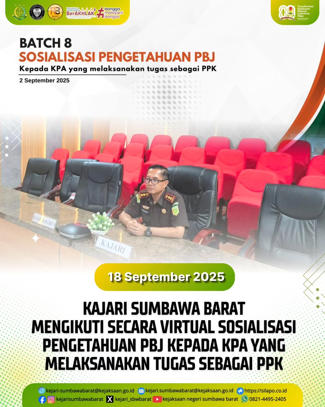 Pada hari Kamis, 18 September 2025. Kepala Kejaksaan Negeri Sumbawa Barat Bapak Agung Pamungkas, SH., MH, mengikuti kegiatan Sosialisasi Pengetahuan PBJ (Pengadaan Barang dan Jasa) kepada KPA (Kuasa Hukum Anggaran) yang melaksanakan tugas sebagai PPK (Pejabat Pembuatan Komitmen) yang dilaksanakan secara Virtual/Daring di Ruang Cinematic Lt. 1 Kantor Kejari Sumbawa Barat.