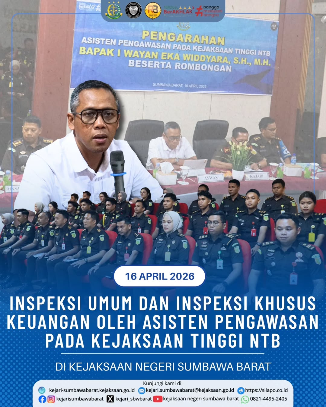 Pada hari Kamis, 16 April 2026. Kejaksaan Negeri Sumbawa Barat menerima Inspeksi Umum dan Audit Keuangan dari Asisten Pengawas Pada Kejaksaan Tinggi NTB Bapak I Wayan Eka Widdyara, S. H., M. H beserta rombongan. Kegiatan ini rutin dilakukan minimal 2 kali setiap tahunnya untuk memastikan pekerjaan di Kejari Sumbawa Barat sudah sesuai dengan SOP dan Manajemen Keuangan yang bersih dan Akuntabel.