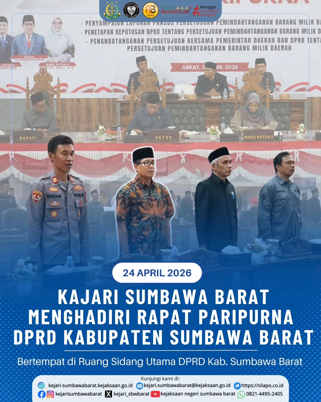 Pada hari Senin, 27 April 2026. Kepala Kejaksaan Negeri Sumbawa Barat Bapak Agung Pamungkas,S.H., M.H, menghadiri Rapat Paripurna DPRD Kabupaten Sumbawa Barat yang dilaksanakan di Ruang Sidang Utama DPRD. Kegiatan tersebut mengagendakan beberapa kegiatan diantara terkait : 1) Bupati menyampaikan terima kasih dan apresiasi kepada DPRD, khususnya pansus, atas kerja keras hingga menyetujui pemindahtanganan barang milik daerah. 2) Persetujuan ini merupakan bentuk komitmen bersama antara pemerintah daerah dan DPRD untuk memperbaiki pengelolaan aset daerah. 3) Pemindahtanganan aset di Smelter Maluk dan Bandara Kiantar bertujuan untuk mendorong percepatan pembangunan dan pertumbuhan…