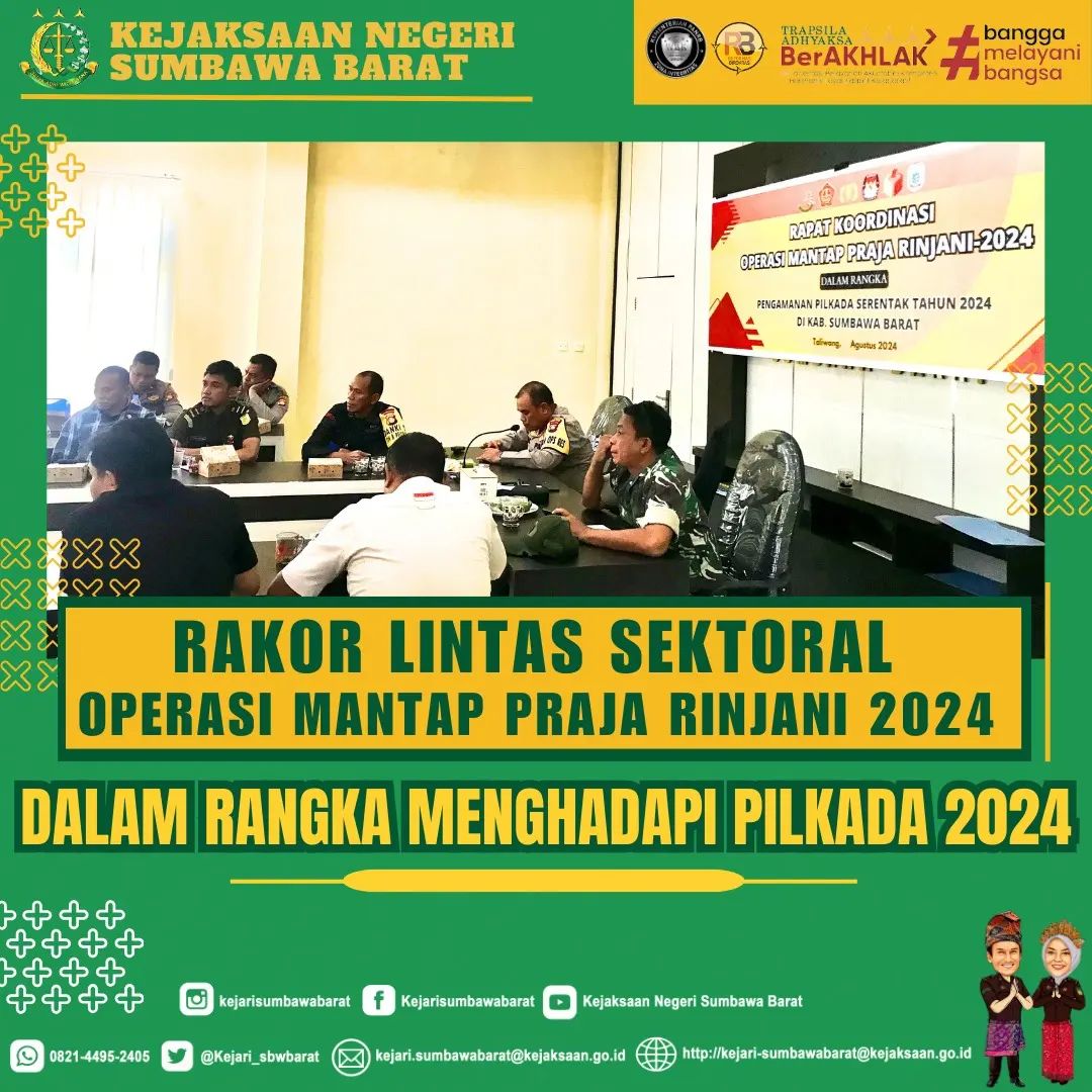 Pada Hari Selasa, 20 Agustus 2024 telah dilaksanakan Video Conference dalam rangka rapat koordinasi lintas sektoral operasi Mantap Praja Rinjani 2024, bertempat di Ruang Vicon Polres Sumbawa Barat, vidcon tersebut membahas prihal koordinasi lintas sektoral untuk menghadapi pilkada yang akan datang.