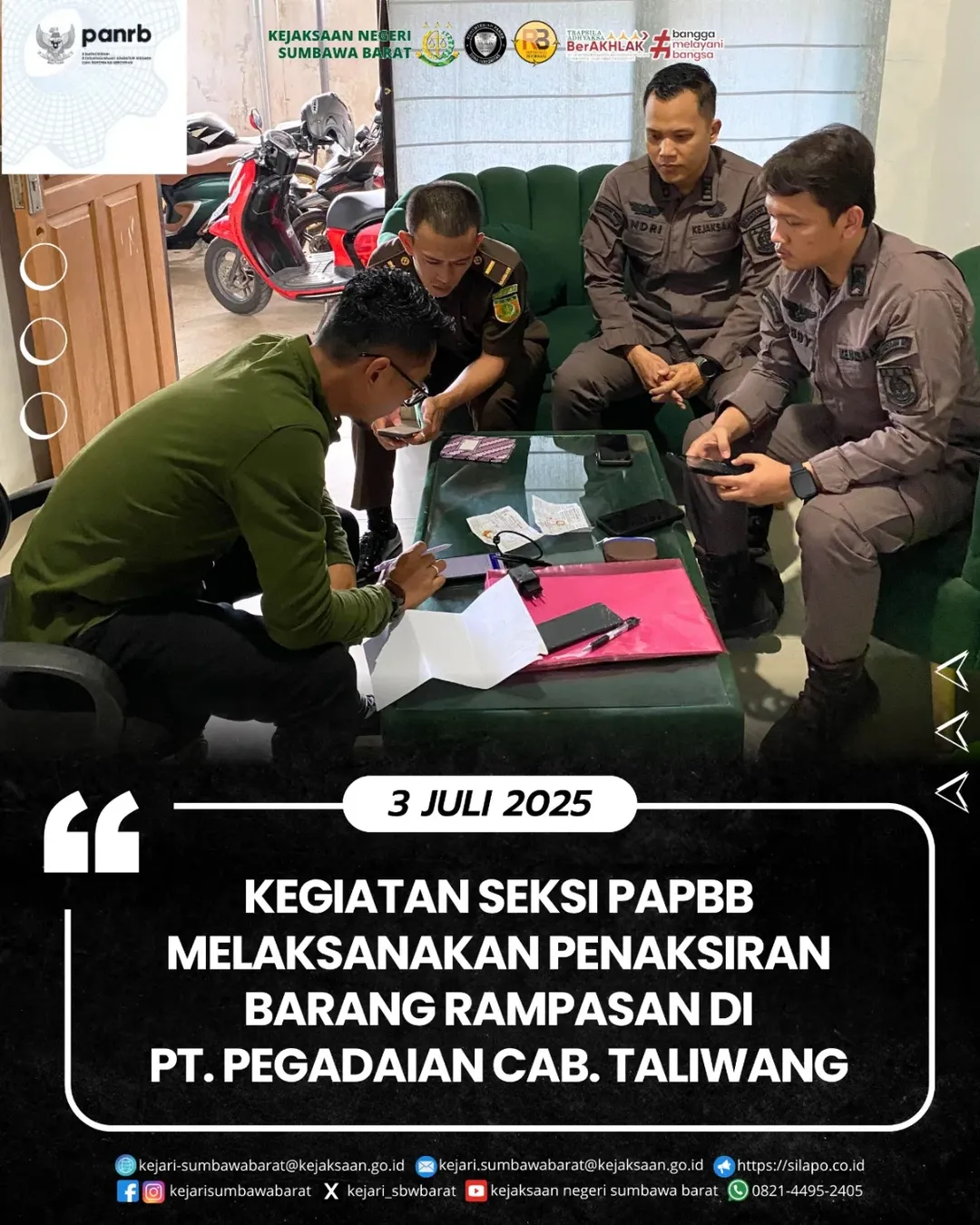 Kamis, 3 Juli 2025. Kejaksaan Negeri Sumbawa Barat melalui Seksi Pemulihan Aset dan Pengelolaan Barang Bukti (PAPBB) melaksanakan kegiatan penaksiran terhadap barang rampasan negara bersama pimpinan PT. Pegadaian Cabang Taliwang,