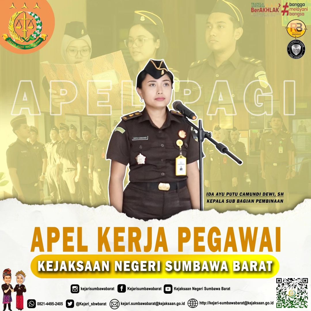 Kepala Kejaksaan Negeri Sumbawa Barat dalam hal ini diwakili oleh Kasubag Pembinaan Ida Ayu Putu Camundi Dewi, SH menjadi pembina dalam pelaksanaan apel kerja pagi di Aula Kantor Kejaksaan Negeri Sumbawa Barat. Dalam amanatnya menegaskan kepada pegawai pentingnya menghafal core value ASN BerAKHLAK yang diterapkan didalam pekerjaan dan juga tetap menjadi Integritas dalam bekerja.