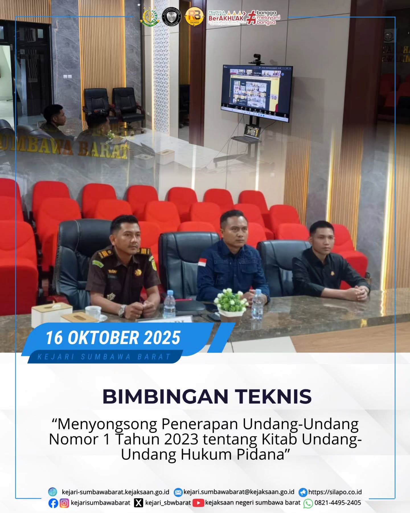 Pada hari Kamis, 16 Oktober 2025. Kepala Kejaksaan Negeri Sumbawa Barat dalam hal ini diwakili oleh Kasi Tindak Pidana Khusus L. Irwan Suyadi, SH,. MH dan Kasi Tindak Pidana Umum Rizki Taufani, SH beserta JPU mengikuti kegiatan secara virtual terkait bimbingan teknis dengan judul Menyongsong Penerapan Undang-undang Nomor 1 Tahun 2023 tentang Kitab Undang-undang Hukum Pidana.