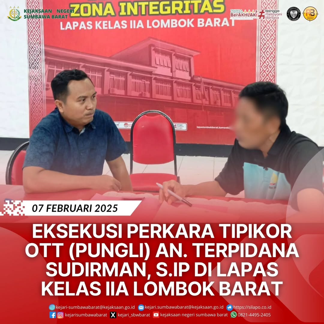 Pada hari Jum’at, 07 Februari 2025. JPU pada Kejaksaan Negeri Sumbawa Barat melaksanakan eksekusi perkara tipikor OTT (Pungli) an terpidana Sudirman, S.Ip di Lapas Kelas II A Lombok Barat.