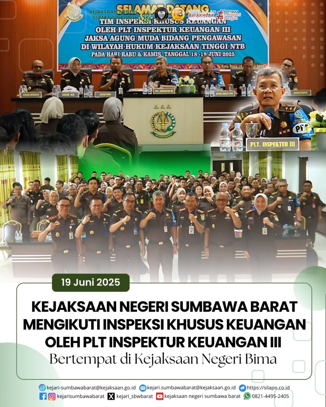 Pada hari Kamis, 19 Juni 2025. Kejaksaan Negeri Sumbawa Barat mengikuti kegiatan Inspeksi Khusus Keuangan yang dipimpin oleh Plt. Inspektur Keuangan III pada Jaksa Agung Muda Pengawasan Kejaksaan Agung RI, Bapak Tedjolekmono, S.H., M.M. beserta tim yang diselenggarakan di Kejaksaan Negeri Bima dan diikuti oleh seluruh Kejaksaan Negeri Se-pulau Sumbawa Kegiatan ini diikuti langsung oleh Kepala Kejaksaan Negeri Sumbawa Barat, Dr. Titin Herawati Utara, S.H., M.H., didampingi oleh Kasubbag Pembinaan, Kasi, dan para Staff pada Kejari Sumbawa Barat. Inspeksi ini bertujuan untuk melakukan evaluasi dan pengawasan terhadap pengelolaan serta pertanggungjawaban…